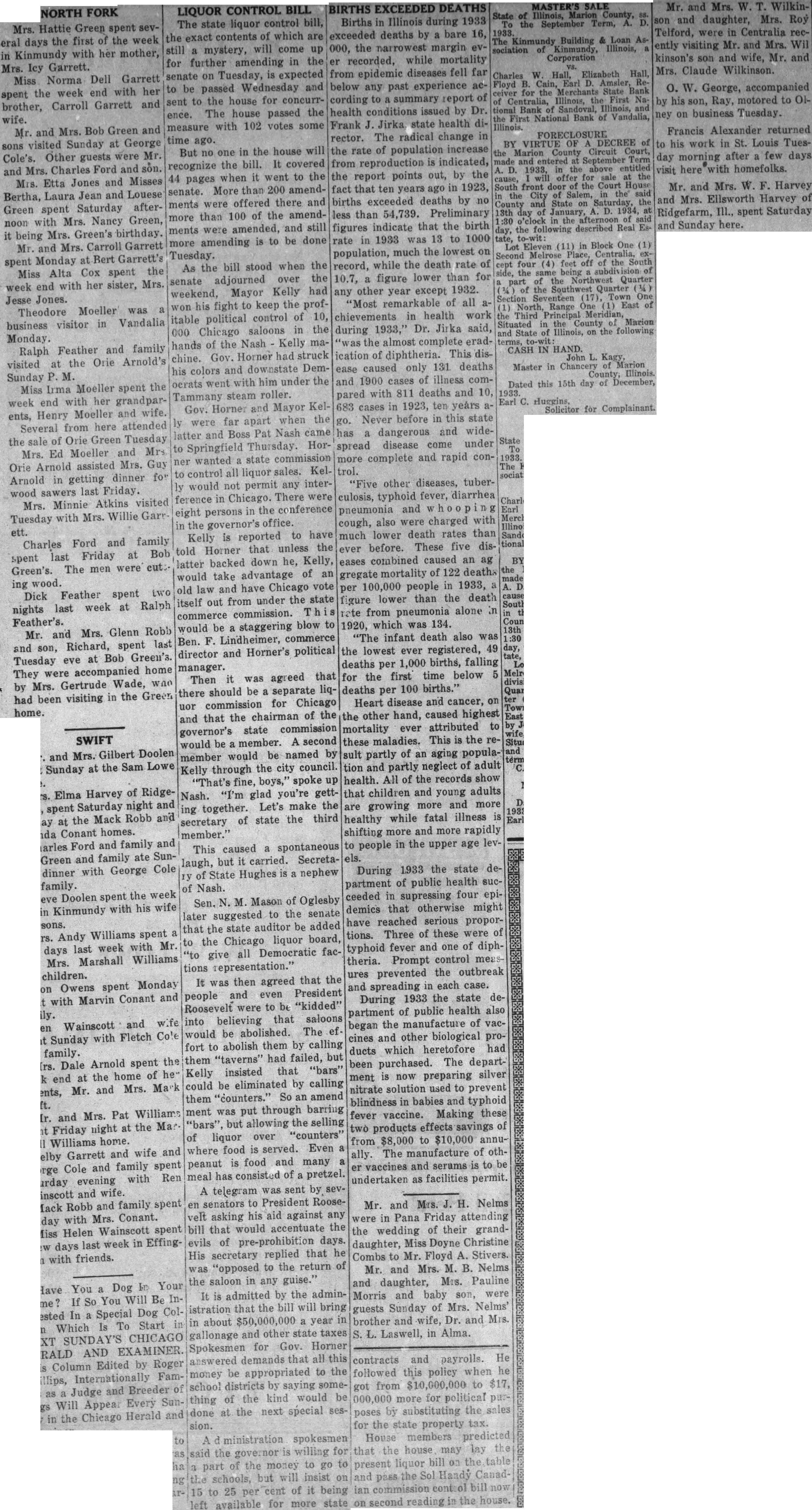NORTH FORK Mrs. Hattie Green spent several days the first of the week in Kinmundy with her mother, Mrs. Icy Garrett. Miss Norma Dell Garrett spent the week end with her brother, Carroll Garrett and wife. Mr. and Mrs. Bob Green and sons visited Sunday at George Cole's. Other guests were Mr. and Mrs. Charles Ford and son. Mrs. Etta Jones and Misses Bertha, Laura Jean and Louese Green spent Saturday afternoon with Mrs. Nancy Green, it being Mrs. Green's birthday. Mr. and Mrs. Carroll Garrett spent Monday at Bert Garrett's Miss Alta Cox spent the week end with her sister, Mrs. Jesse Jones. Theodore Moeller was a business visitor in Vandalia Monday. Ralph Feather and family visited at the Orie Arnold's Sunday P. M. Miss Irma Moeller spent the week end with her grandparents, Henry Moeller and wife. Several from here attended the sale of Orie Green Tuesday Mrs. Ed Moeller and Mrs. Orie Arnold assisted Mrs. Guy Arnold in getting dinner for wood sawers last Friday. Mrs. Minnie Atkins visited Tuesday with Mrs. Willie Garrett. Charles Ford and family spent last Friday at Bob Green's. The men were cut.ing wood. Dick Feather spent two nights last week at Ralph Feather's. Mr. and Mrs. Glenn Robb and son, Richard, spent last Tuesday eve at Bob Green's. They were accompanied home by Mrs. Gertrude Wade, wao had been visiting in the Green home. LIQUOR CONTROL BILL The state liquor control bill, the exact contents of which are still a mystery, will come up for further amending in the senate on Tuesday, is expected to be passed Wednesday and sent to the house for concurrence. The house passed the measure with 102 votes some time ago. But no one in the house will recognize the bill. It covered 44 pages when it went to the senate. More than 200 amendments were offered there and more than 100 of the amendments were amended, and still more amending is to be done Tuesday. As the bill stood when the senate adjourned over the weekend, Mayor Kelly had won his fight to keep the profitable political control of 10, 000 Chicago saloons in the hands of the Nash Kelly machine. Gov. Horner had struck his colors and downstate Democrats went with him under the Tammany steam roller. Gov. Horner and Mayor Kelly were far apart when the latter and Boss Pat Nash came to Springfield Thursday. Horner wanted a state commission to control all liquor sales. Kelly would not permit any interference in Chicago. There were eight persons in the nference in the governor's office. Kelly is reported to have told Horner that unless the latter backed down he, Kelly, would take advantage of an old law and have Chicago vote itself out from under the state commerce commission. This would be a staggering blow to Ben. F. Lindheimer, commerce director and Horner's political manager. Then it was agreed that there should be a separate liquor commission for Chicago and that the chairman of the governor's state commission would be a member. A second member would be named by Kelly through the city council. "That's fine, boys," spoke up Nash. "I'm glad you're getting together. Let's make the secretary of state the third member." This caused a spontaneous laugh, but it carried. Secretary of State Hughes is a nephew of Nash. Sen. N. M. Mason of Oglesby later suggested. to the senate that the state auditor be added to the Chicago liquor board, "to give all Democratic factions representation." It was then agreed that the people and even President Roosevelt were to be "kidded" into believing that saloons would be abolished. The effort to abolish them by calling them "taverns" had failed, but Kelly insisted that "bars" could be eliminated by calling them "counters." So an amend ment was put through barring "bars", but allowing the selling of liquor over "counters" where food is served. Even a peanut is food and many a meal has consisted of a pretzel. A telegram was sent by seven senators to President Roosevelt asking his aid against any bill that would accentuate the evils of pre-prohibition days. His secretary replied that he was "opposed to the return of the saloon in any guise." It is admitted by the administration that the bill will bring in about $50,000,000 a year in gallonage and other state taxes Spokesmen for Gov. Horner answered demands that all this money be appropriated to the school districts by saying something of the kind would be done at the next special session. A d ministration spokesmen said the governor is willing for a part of the money to go to the schools, but will insist on 15 to 25 per cent of it being BIRTHS EXCEEDED DEATHS Births in Illinois during 1933 1933. exceeded deaths by a bare 16, 000, the narrowest margin ever recorded, while mortality from epidemic diseases fell far below any past experience according to a summary report of health conditions issued by Dr. Frank J. Jirka state health director. The radical change in the rate of population increase from reproduction is indicated, the report points out, by the fact that ten years ago in 1923, births exceeded deaths by no less than 54,739. Preliminary figures indicate that the birth rate in 1933 was 13 to 1000 tate, population, much the lowest on record, while the death rate of 10.7, a figure lower than for any other year except 1932. "Most remarkable of all achievements in health work during 1933," Dr. Jirka said, "was the almost complete eradication of diphtheria. This disease caused only 131 deaths and 1900 cases of illness compared with 811 deaths and 10, 683 cases in 1923, ten years ago. Never before in this state has a dangerous and widespread disease come under more complete and rapid control. "Five other diseases, tuberculosis, typhoid fever, diarrhea pneumonia and h 0 0 ing cough, also were charged with much lower death rates than ever before. These five diseases combined caused an ag gregate mortality of 122 deaths per 100,000 people in 1933, a figure lower than the death rate from pneumonia alone in 1920, which was 134. "The infant death also was the lowest ever regist