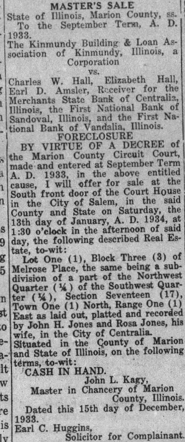 MASTER'S SALE State of Illinois, Marion County, SS. To the September Term, A. D. 1933. The Kinmundy Building & Loan Association of Kinmundy, Illinois, a Corporation vs. Charles W. Hall, Elizabeth Hall, Earl D. Amsler, Receiver for the Merchants State Bank of Centralia, Illinois, First National Bank of Sandoval, Illinois, and the First National Bank of Vandalia, Illinois. FORECLOSURE BY VIRTUE OF A DECREE of the Marion County Circuit Court, made and entered at September Term A. D. 1933, in the above entitled cause, will offer for sale at the South front door of the Court House in the City of Salem, in the said County and State on Saturday, the 13th day of January, A. D. 1934, at 1:30 o'clock in the afternoon of said day, the following described Real Estate, to-wit: Lot One (1), Block Three (3) of Melrose Place, the same being subdivision of a part of the Northwest Quarter (1/4) of the Southwest Quarter (%), Section Seventeen (17), Town One (1) North, Range One (1) East as laid out, platted and recorded by John H. Jones and Rosa Jones, his wife, in the City of Centralia. Situated in the County of Marion and State of Illinois, on the following terms, to-wit: CASH IN HAND. John L. Kagy, Master in Chancery of Marion County, Illinois. Dated this 15th day of December, 1933. Earl C. Huggins, Solicitor for Complainant