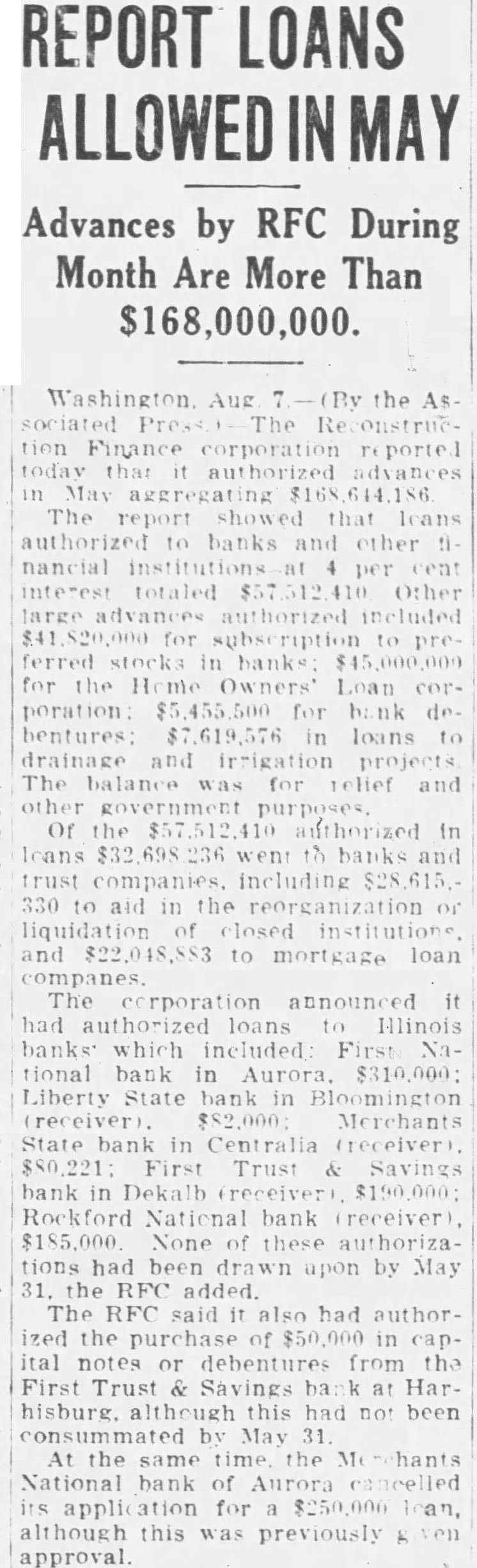 REPORT LOANS Advances by RFC During Month Are More Than sociated Finance authorized report banks and other nancial totaled Other ferred Loan poration for $7,619,576 loans and irrigation balance and Of trust aid liquidation closed mortgage loan companes. The announced had authorized loans Illinois banks which included First tional bank Liberty State bank in Merchants State bank Centralia (receiver). First Trust bank National bank (receiver), None these tions had been upon by May added. The RFC said had authorized the ital notes debentures from the Trust Harhisburg. this had not been May the National bank although this previously approval.