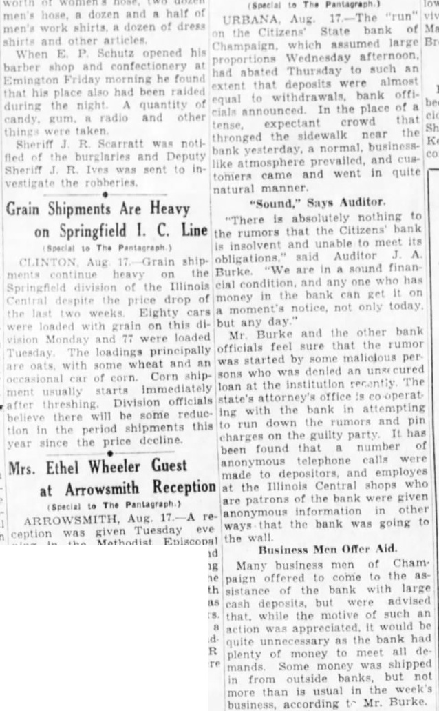 Grain Shipments Are Heavy on Springfield I. C. Line (Special to The Pantagraph.) Aug "run" State bank of the Citizens' proportions Wednesday afternoon, had abated Thursday to such an extent that deposits almost equal to withdrawals, bank offiplace of announced. In the cials crowd that tense, expectant sidewalk near the thronged the bank yesterday, normal, businesslike atmosphere prevailed, and customers came and went in quite natural "Sound," Says Auditor "There is absolutely nothing to the rumors that the bank is insolvent unable to meet its (Special The Pantagraph.) obligations,' said Auditor A. Aug Grain Burke are in sound financontinue heavy on the one who has Illinois cial any Springfield division of the bank can get It on in the Central the drop of money despite price notice, not only the two weeks Eighty cars but any day were loaded with grain on this diand the other bank Burke and were loaded Monday feel sure that the rumor officials Tuesday The loadings principally started by some malicious wheat and an was are who was denied an Corn ship- sons occasional car of corn. The loan at the institution usually starts immediately ment attorney's office Division officials ing with the bank in attempting will be some reducbelieve there to run down the rumors and pin tion in the period shipments this charges on the guilty party It has year since the price decline. been found that number of telephone calls were Mrs. Ethel Wheeler Guest made depositors, and employes at the Illinois Central shops who at Arrowsmith Reception are patrons the bank given Special The Pantagraph.) anonymous information other ARROWSMITH, Aug. ways that the bank was going to ception was given Tuesday eve the ning in the Methodist Episcopal Business Men Offer Aid. Many business men of Champaign to come to the as sistance of the bank with large cash deposits, but were advised that. while the motive of such an action was appreciated. would be quite unnecessary as the bank had plenty of money to meet all demands. Some money was shipped in from outside banks, but not more than is usual in the week's business, according to Mr. Burke.