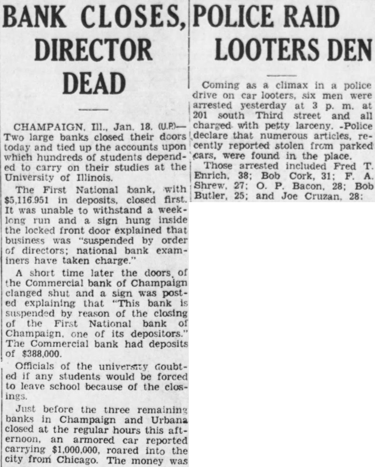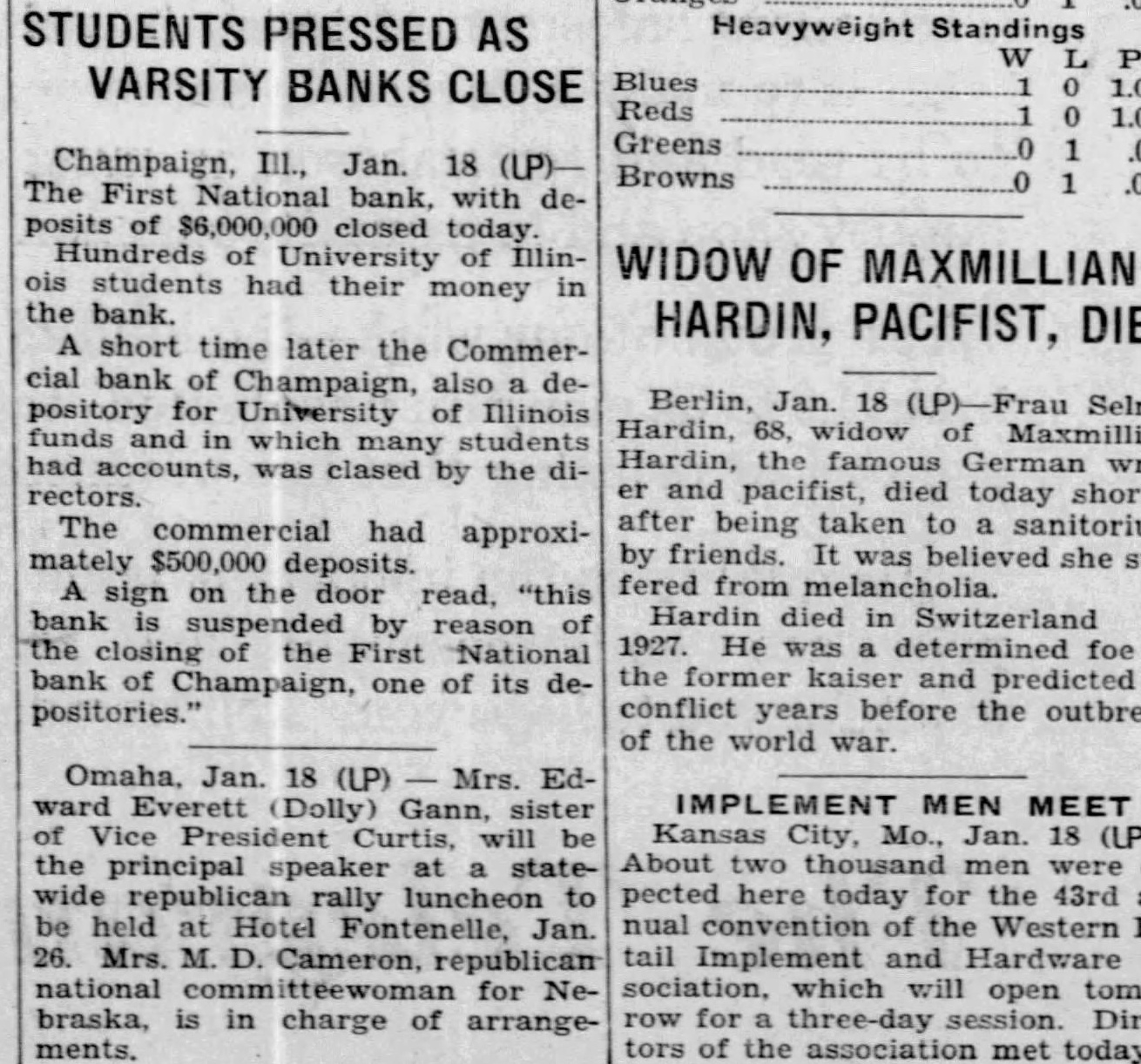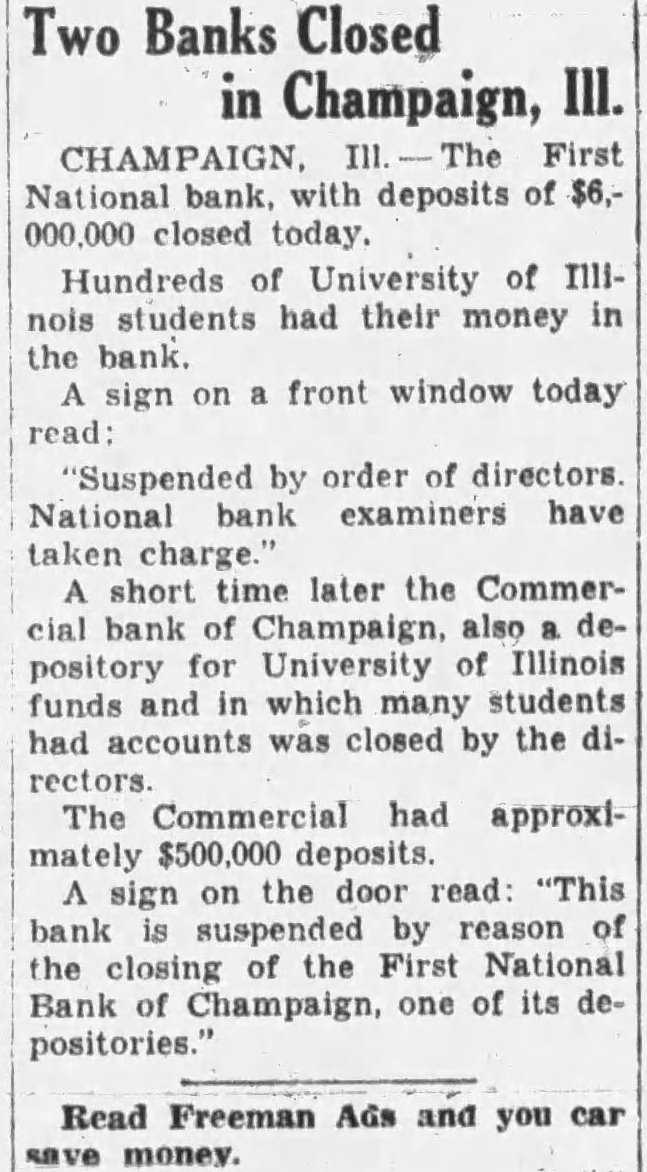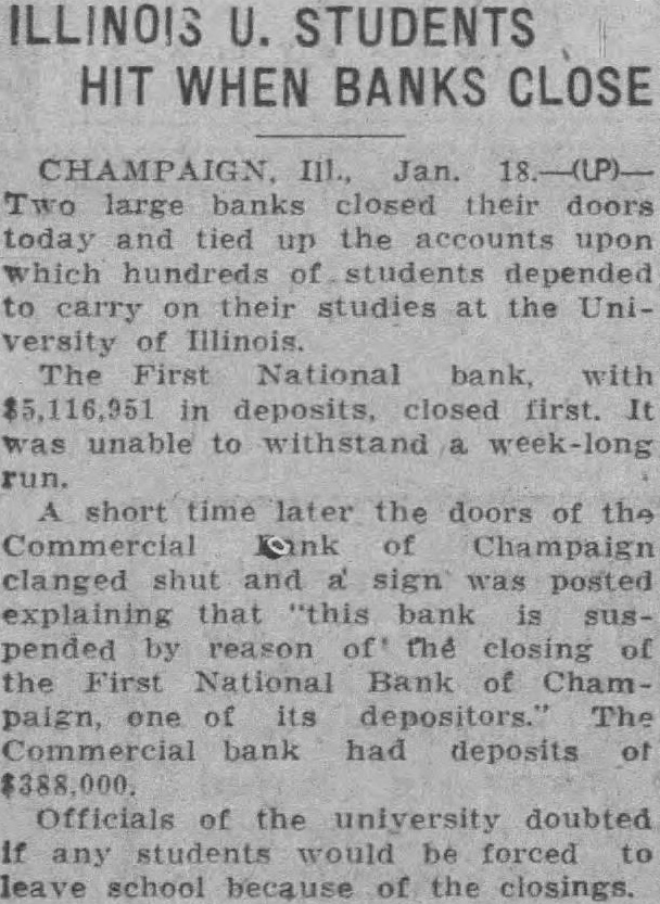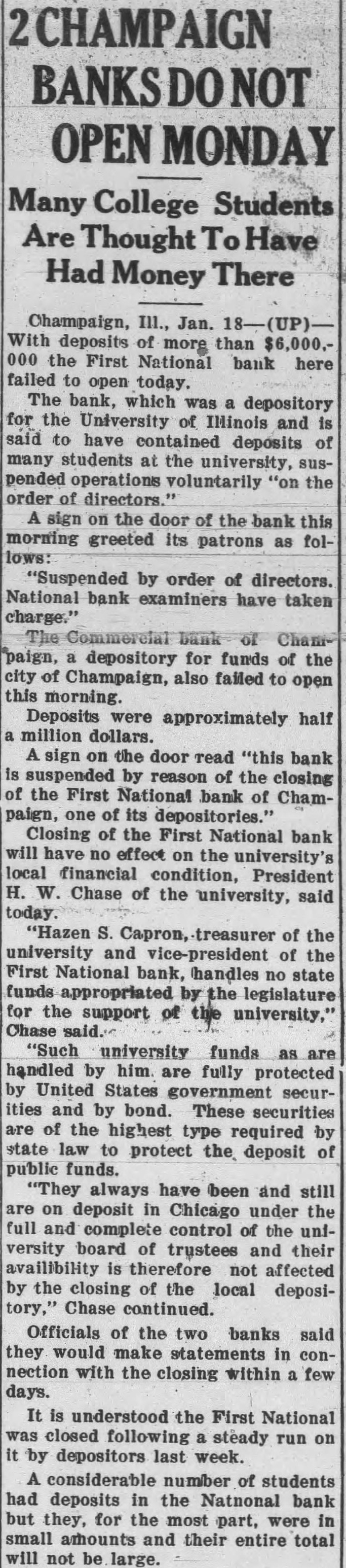 Members yesterday united for concerted and speedy action, but stuck to their policy to "make haste slowly.' The complete calendar of committees, including those of the deposiand stockholders both banks and from the chamber of commerce, follows: Chamber of Commerce: Walter Savage, Prof E. Bogart. Bauer, R. M. Campbell, Ray Sparks, Parkhill, James White, Petry, George McComb. George Mattis, W. Wright, John W. Armstrong, Fred Russell, and Dan Morrissey. First National stockholders: Willis, Dan Swannell, and W. E. Clifford. Commercial stockholders: Somers, Thomas, Hagan, and Paul Busey. First National depositors George Huff. chairman: E. Cole, secretary: Kiler, Busch, Prof. Sveinbjorn legal counsel of the University, Millard, Frank Barrett, Van Wegent, James W. Dr. Bucher, Albert Jr., Stiritz, John Prof. Frederic of the department of economics, Dr. Cleaves Bennett, Dean Thompson of the College of Commerce, Carman, professor emeritus of the department of physics, George Garst, Fluck, and Pearson. Commercial depositors: Finder, Harry Casper, Anthony Koehnemann, Sackett, Hustable, Holmes, Lee Greenman, W. E. Quinand Ernest Moon.