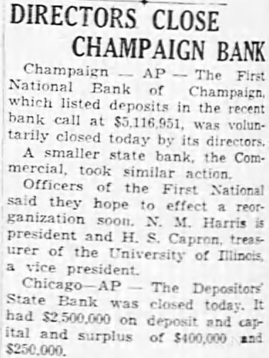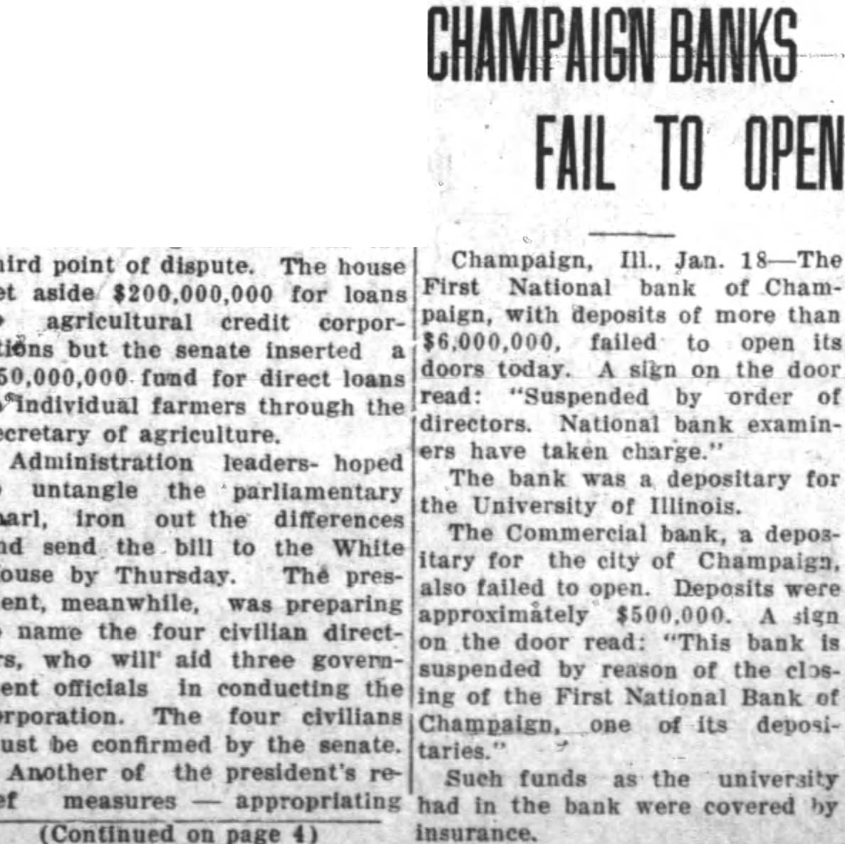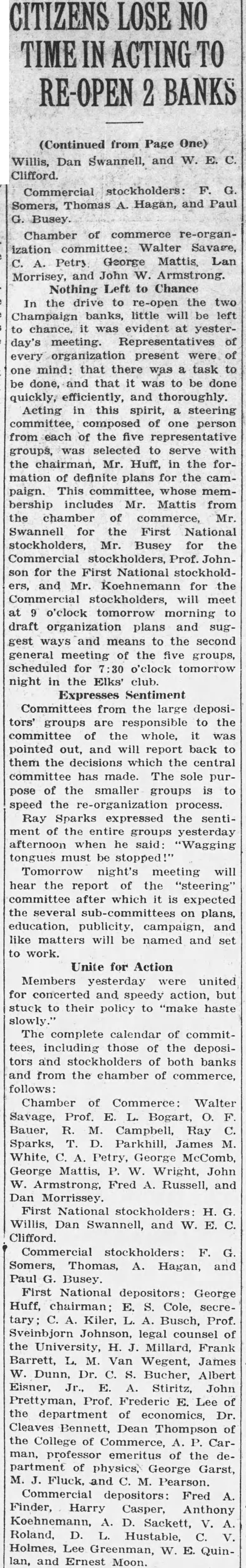 Commercial stockholders: Thomas Hagan, and Paul Somers, Chamber commerce re-organization committee: Walter Savage, Petry George Lan Morrisey, and John Armstrong. Nothing to Chance the drive to re-open the two Champaign banks, little will left was evident at yesterday's meeting. Representatives of present of mind: that there was task to be done, and that was to be done quickly, and thoroughly. Acting in this spirit, steering committee, composed of person from each of the five representative groups, was selected serve with the chairman, Mr. Huff, in the formation of definite plans for the campaign. This committee, whose membership includes Mr. Mattis from the chamber of commerce, Mr. Swannell for the First National stockholders, Mr. Busey for the Commercial stockholders, for the First National and Koehnemann for the Commercial stockholders, will meet at o'clock tomorrow morning draft organization plans and suggest ways and means to the second general of the five groups, scheduled for o'clock tomorrow night in the Elks' club. Expresses Sentiment Committees from large depositors' groups are responsible to the committee of the whole, was pointed out, and will report back them the decisions which the central committee has made. The sole purpose of smaller groups speed the re-organization process. Ray Sparks expressed the sentiment the entire groups yesterday afternoon when he said: tongues stopped!" Tomorrow night's meeting will hear the report of "steering" committee after which expected the several on plans, education, publicity, campaign, and like matters will be named and set to work.