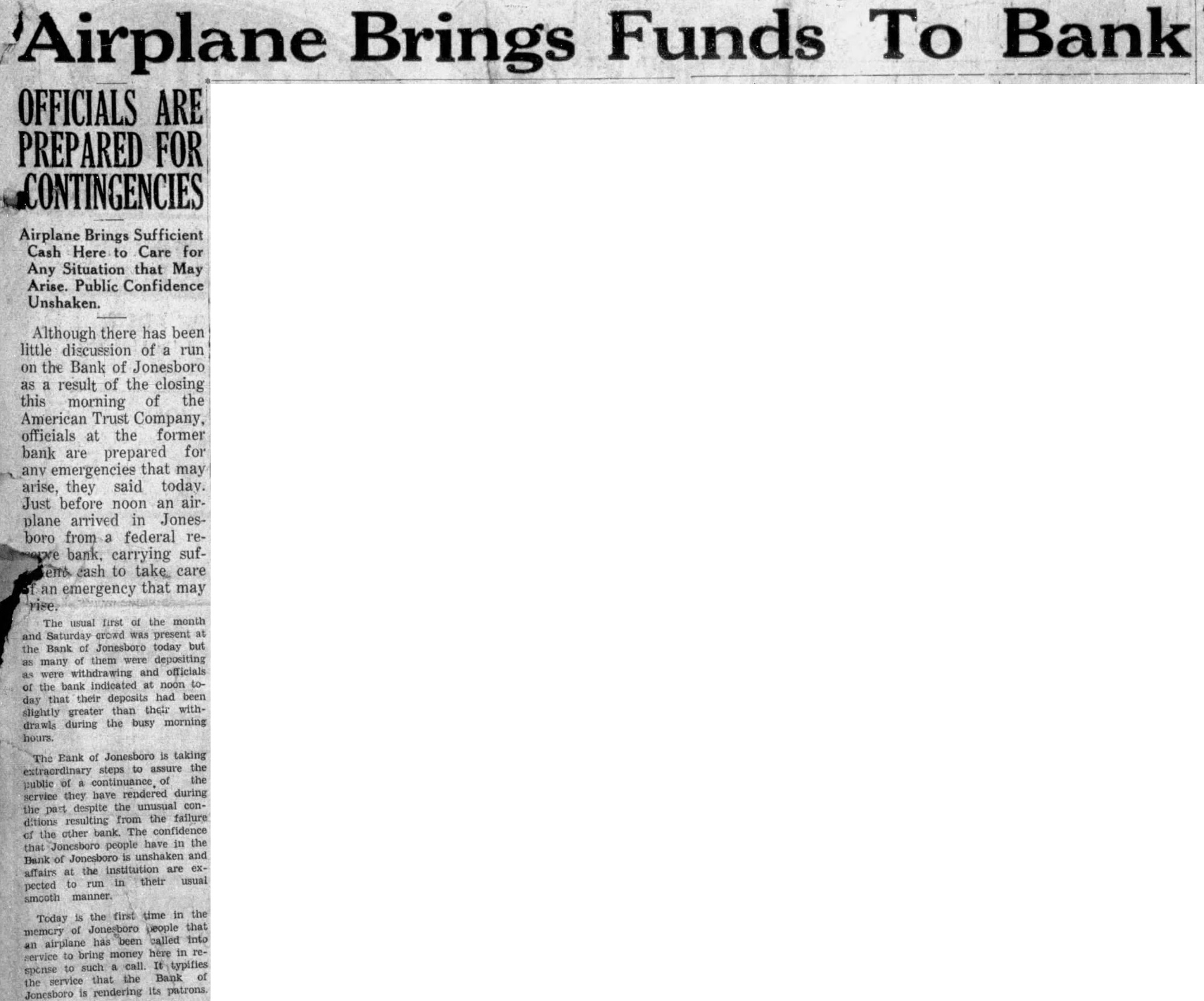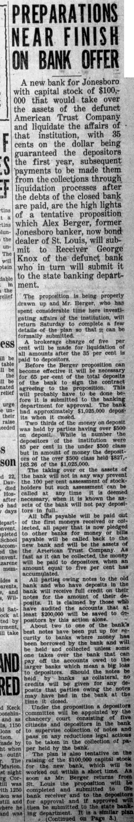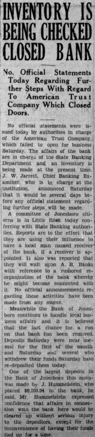 In the meanwhile business interests of Jonesboro will be served by a sterling business institution, longestablished and in stable financial condition at the present time, the Bank of Jonesboro. The Bank of Jonesboro has served this community for the past forty years and it is stronger now than ever before during that period of time. The large percentáge of the bank's funds is invested in bonds and cash securities. The officials of the bank always have been conservative in their investments and have never taken over any interest in other banks. Statements of the Bank always have shown a high percentage of funds invested in cash and high grade conservative securities. The bank is at present in the finest condition in its history and will continue to be able to care for all the banking needs of the community. The present situation is one which will truly test the real spirit of Jonesboro and Craighead county. Conditions have been poor for severall months and to just what extent the failure of the American Trust Company will effect those condition depends largely upon the manner in which Jonesboro and Craighead County citizens respond to the demands of the situation. There is no reason for further fear regarding Jonesboro's banking institutions. No run on the Bank of Jonesboro is expected or feared, but bank official have announced that they are ready for any contingencies that may arise. A calm consideration of the situation-not hot-headed by industrious action along the proper lines will go far toward returning conditions to normalcy.