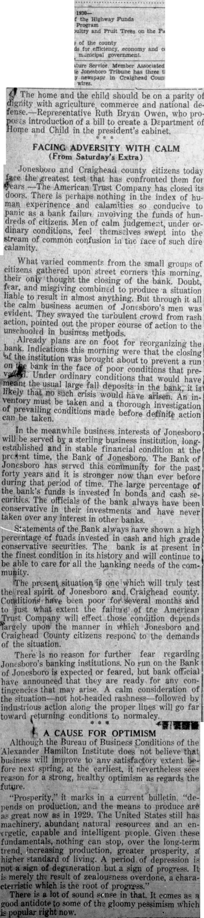 FACING ADVERSITY WITH CALM Jonesboro and Craighead county citizens today face the greatest test that has confronted them for years American Trust Company has closed its doors. There is perhaps nothing in the index of human experinence and calamities so conducive to panic as a bank failure involving the funds of hundreds of citizens. Men of calm judgement, under ordinary conditions, feell themselves swept into the stream of common confusion in the face of such dire calamity. What varied comments from the small groups of citizens gathered upon street corners this morning, their only thought the closing of the bank. Doubt, fear, and misgiving combined to produce a situation liable to result in almost anything. But through it all the calm business acumen of Jonesboro's men was evident. They swayed the turbulent crowd from rash action, pointed out the proper course of action to the unschooled in business methods. Already plans are on foot for reorganizing the bank. Indications this morning were that the closing of the institution was brought about to prevent a run on the bank in the face of poor conditions that prevailed. Under ordinary conditions that would have meant the usual large fall deposits in the bank, it is likely that no such crisis would have arisen. An inventory must be taken and a thorough investigation of prevailing conditions made before definite can be taken.