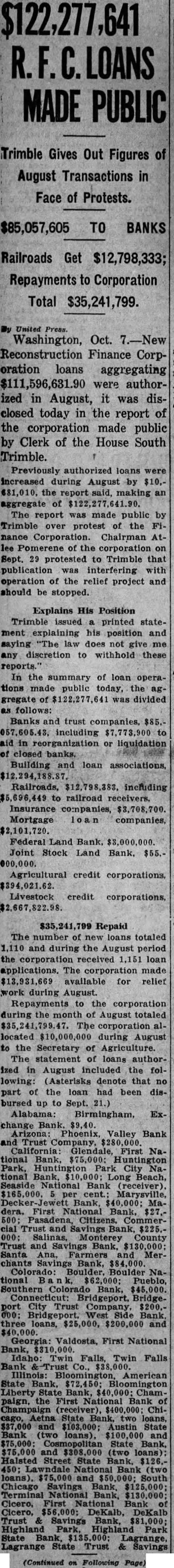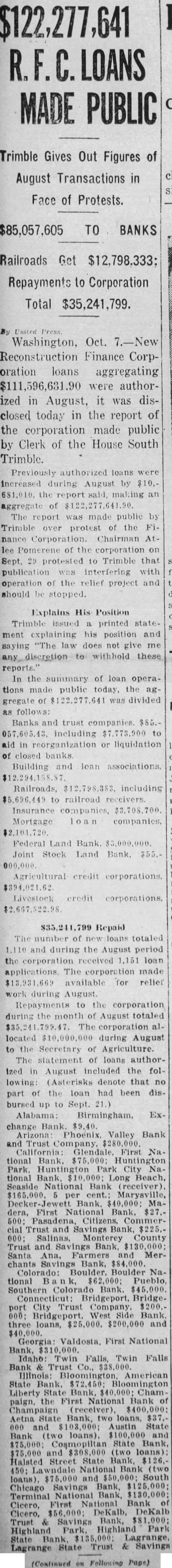 Trimble issued printed statement explaining his position and saying "The law does not give me discretion to withhold these In the summary of loan operations made public today the aggregate of $122,277. was divided as follows: Banks and trust companies. $85.including to aid in reorganization or liquidation of closed banks. Building and loan associations, Railroads, $12,798,383. including $5,696,449 to railroad receivers. Insurance companies, $3,708,700. Mortgage loan companies, Federal Land Bank. $3,000,000. Joint Stock Land Bank, $55.-