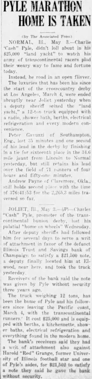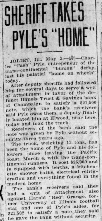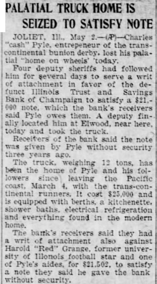 (By the Associated Press) Joliet, III., May 3.-Charles "Cash" Pyle, promoter of the transcontinental bunion derby, has lost his palation "home on wheels." After deputy sheriffs had followed him for several days to serve a writ of attachment in favor of the defunct Illinois Trust and Savings bank of Champaign to satisfy a $21,500 note, which the bank's receivers said Pyle owes them, a deputy found him at Elwood, near here, and took the truck. Receivers of the bank said the note was given by Pyle without security three years ago. The truck, weighing 12 tons, has been the home of Pyle and his followers since leaving the Pacific coast. March 4, with transcontinental runners. It cost $25,000 and is equipped with berths, a kitchenette, shower baths, electrical refrigeration and everything found in the modern home. The bank's receivers said they had a writ of attachment also against Harold "Red" Grange, former University of Illinois football star and one of Pyle's aides, for $21,502 to satisfy a note they said he gave the bank without security.