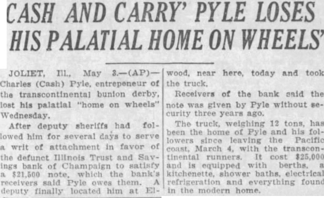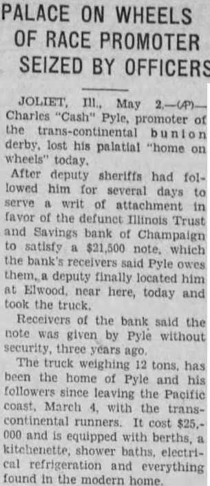 Charles (Cash) Pyle, entrepeneur of the transcontinental bunion derby, lost his palatial "home on wheels" Wednesday. After deputy sheriffs had followed him for several days to serve a writ of attachment in favor of the defunct Illinois Trust and Savings bank of Champaign to satisfy $21,500 which the bank's receivers said Pyle them. deputy finally located him at El- wood, near here, today and took the truck. Receivers of the bank said the note was given by Pyle without security three years ago. The truck, weighing 12 tons, has been the home of and his followers since leaving the Pacific coast, March 4, with the transcontinental runners. cost $25,000 and is equipped with kitchenette, shower baths. electrical refrigeration and everything found in the modern home.