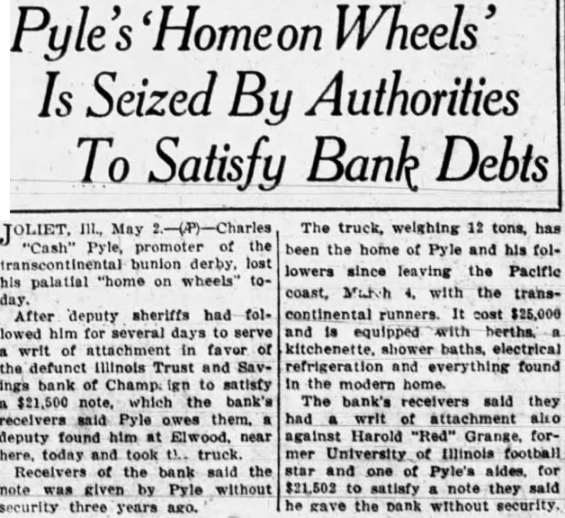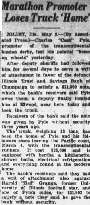May Associated "Cash" promoter the transcontinental bunion derby, lost his palatial on wheels" After deputy had followed him for several days to serve writ of in of the defunct Illinois Trust and Savings Bank of Champaign to satisfy $21,500 note, which the bank's receivers said Pyle owes finally located him at near today and took the truck. Receivers of the bank said note was given by Pyle security three years The weighing 12 has been the home Pyle and his lowers since leaving the Pacific coast, March 4. with the runners. cost $25,000 and equipped with berths, kitchenette. shower baths, electrical refrigeration and everything found in the modern home. The bank's receivers said they had writ of attachment also against Harold "Red" Grange, former University of Illinois football star, and one of Pyle's for $21,502 satisfy note they said he gave the bank without security.