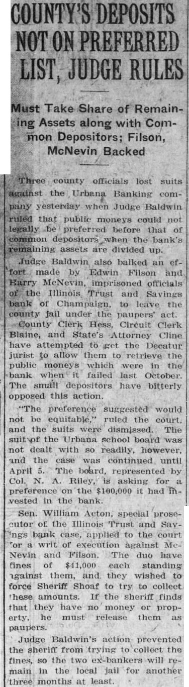 Must Take Share of RemainAssets along with Common Depositors; Filson, McNevin Backed county officials lost suits against the Urbana Banking company yesterday when Judge Baldwin ruled that public moneys could not legally preferred before that of common depositors bank's remaining assets are divided up. Judge Baldwin also balked an effort. made by Edwin Filson and Harry McNevin, imprisoned officials the Illinois Trust and Savings bank of Champaign to leave the county jail under the paupers' act. County Clerk Hess, Circuit Clerk Blaine, and State's Attorney Cline have attempted to get the Decatur jurist to allow them retrieve the public moneys which were in the bank when failed last October The small depositors have bitterly opposed this action. "The preference suggested would not be equitable,' ruled the court, and the suits were dismissed. The suit of the Urbana school board was not dealt with so readily, however, and the case was continued until April The board, represented by Col. N. A. Riley, is asking for preference on the $100,000 it had invested in the bank