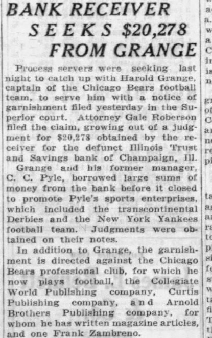 BANK RECEIVER $20,278 FROM GRANGE Process seeking last night to up captain of the Bears football garnishment filed the Suof perior court. Attorney Gale filed the out of judg ment for obtained by the for the defunct Illinois Trust and Savings of Champaign, III Grange his former manager, C. C. Pyle, large sums of money from the bank before it closed to promote Pyle's enterprises, which the Derbies the York Yankees football were tained on notes. In to Grange, the garnishment is Chicago Bears club, for which he plays football, Collegiate World Curtis Publishing company, Arnold Brothers Publishing company for he and one Frank Zambreno.