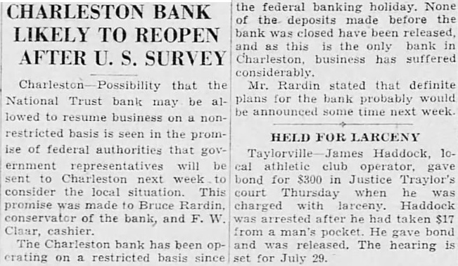 CHARLESTON BANK LIKELY TO REOPEN AFTER U.S. SURVEY Charleston- Possibility that the National Trust bank may be allowed to resume business on a non restricted basis is seen in the promise of federal authorities that gov ernment representatives will be sent to Charleston next week to consider the local situation. This promise was made to Bruce Rardin, conservator of the bank, and F. W. Claar, cashier. The Charleston bank has been opcrating on a restricted basis since the federal banking holiday. None of the deposits made before the bank was closed have been released, and as this is the only bank in Charleston, business has suffered considerably. Mr. Rardin stated that definite plans for the bank probably would be announced some time next week. HELD FOR LARCENY cal athletic club operator, gave bond for $300 in Justice Traylor's court Thursday when he was charged with larceny. Haddock was arrested after he had taken $17 from a man's pocket. He gave bond and was released. The hearing is set for July 29.
