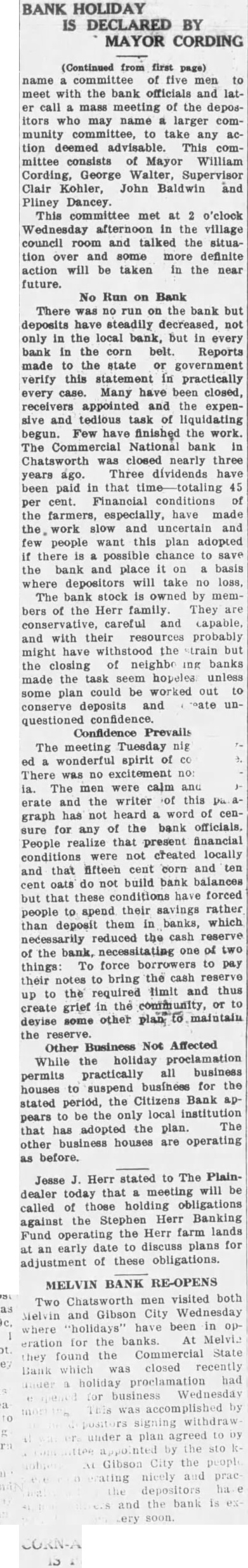BANK HOLIDAY IS DECLARED BY MAYOR CORDING (Continued from first page) name committee of five men to meet with the bank officials and er call mass meeting of the depositors who may name larger munity committee, to take any tion deemed advisable. This committee consists of Mayor William Cording, George Walter, Supervisor Clair Kohler, John Baldwin and Pliney Dancey. This committee met at o'clock Wednesday afternoon in the village council room and talked the situation over and some more definite action will be taken in the near future. No Run on Bank There was no run on the bank but deposits have steadily decreased, not only in the local bank, but in every bank in the corn belt. Reports made to the state or government verify this statement in practically every case. Many have been closed, receivers appointed and the expensive and tedious task of liquidating begun. Few have finished the work. The Commercial National bank in Chatsworth was closed nearly three ago. Three dividends have years been paid in that cent. Financial conditions of per the farmers, especially, have made slow and uncertain and few people want this plan adopted if there is possible chance to the bank and place on basis where depositors will take no loss, The bank stock is owned by members of the Herr family. They careful and capable, and with their resources probably might have withstood the strain but the closing of neighbo banks made the task seem hopeles unless some plan could be worked out to conserve deposits and questioned confidence. Confidence Prevails The meeting Tuesday nig wonderful spirit of There was no excitement The men were calm and ia. erate and the writer of this graph has not heard word of the bank officials. sure for any of People realize that present financial were not created locally conditions and that fifteen cent corn and ten do not build bank balances oats but that these conditions forced their savings rather people to spend banks, which than deposit them reduced the cash reserve necessarily of the bank, necessitating one of two To force borrowers to pay things: to bring the cash reserve their notes limit and thus to the required up create grief in the community, or to other maintain devise some the reserve. Business Not Affected Other While holiday all business permits practically business for the houses to suspend the Citizens Bank apstated period, local institution to be the only pears The that has adopted the plan. business houses are operating other before. Jesse Herr stated to The Plainmeeting will be dealer today that of those holding obligations called Herr Banking against the Stephen Herr farm lands Fund operating the to discuss plans for early date an adjustment of these obligations. BANK RE-OPENS MELVIN visited both Two Chatsworth men Gibson City Wednesday and "holidays" have been for the banks. At eration the Commercial State found which was closed recently had holiday business Wednesday withdraw agreed the