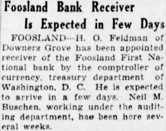 16 Per Cent Dividend to Be Paid Depositors of Foosland Bank The Receiver urges that all past dividend checks be called for. H. O. Feldman, receiver of the First National bank of Foosland, has issued the following statement: third dividend, representing 16 per cent of the depositors proven claims, has been declared and checks were distributed on Wednesday and Thursday of this week, and those who failed to call for checks on those days can receive them on any Wednesday thereafter. When calling for dividend checks, it will be necessary for depositors to present their Receivers Certificate: receipts for dividend checks will be mailed to out-of-town depositors upon re-