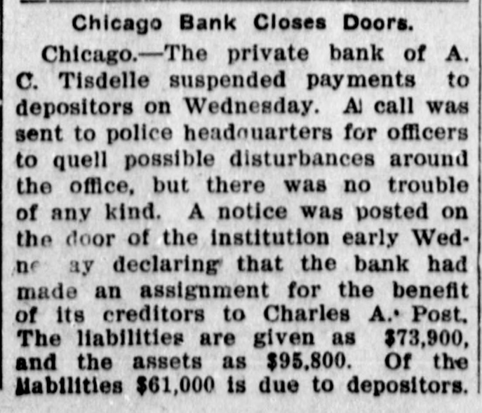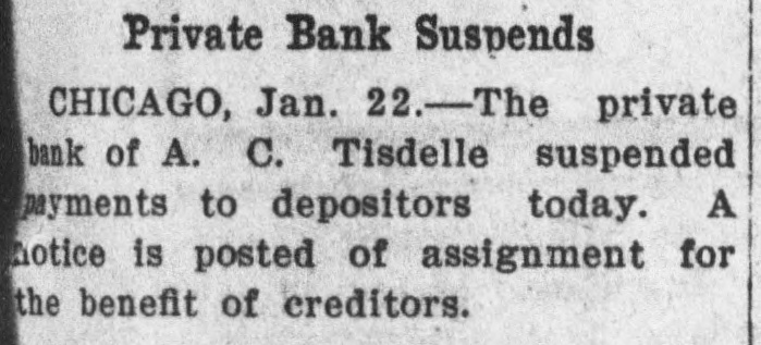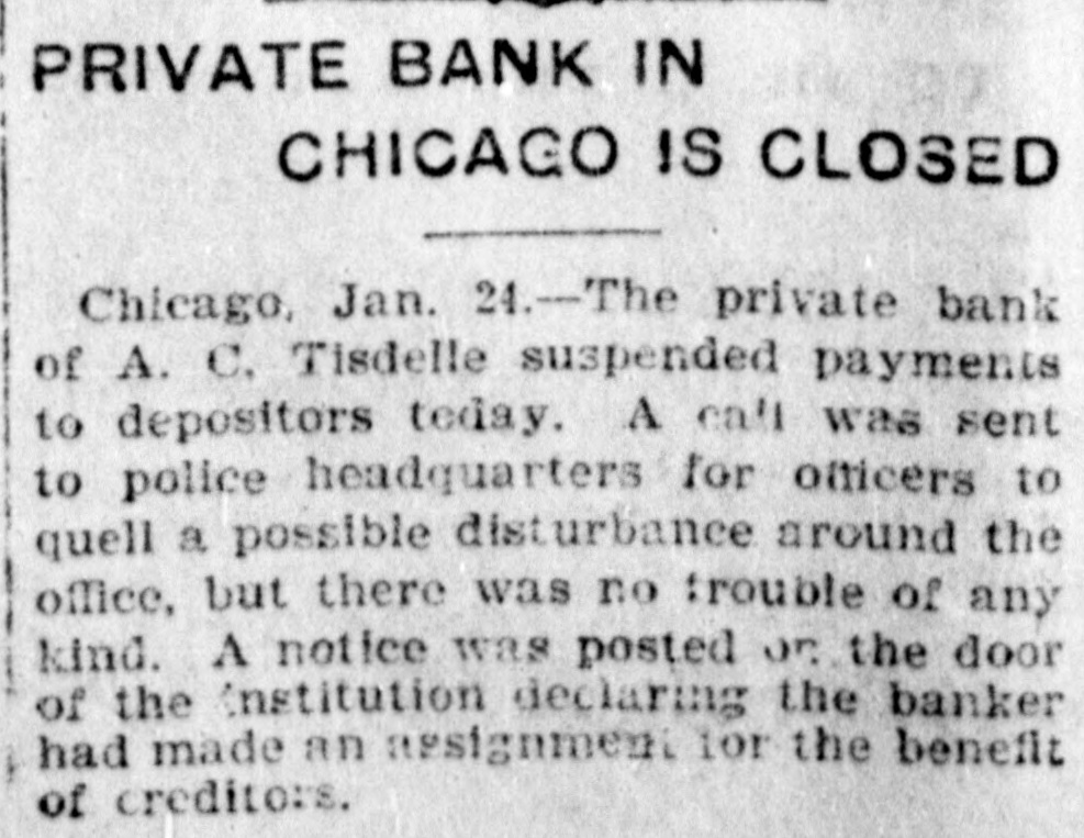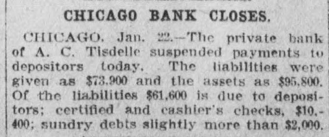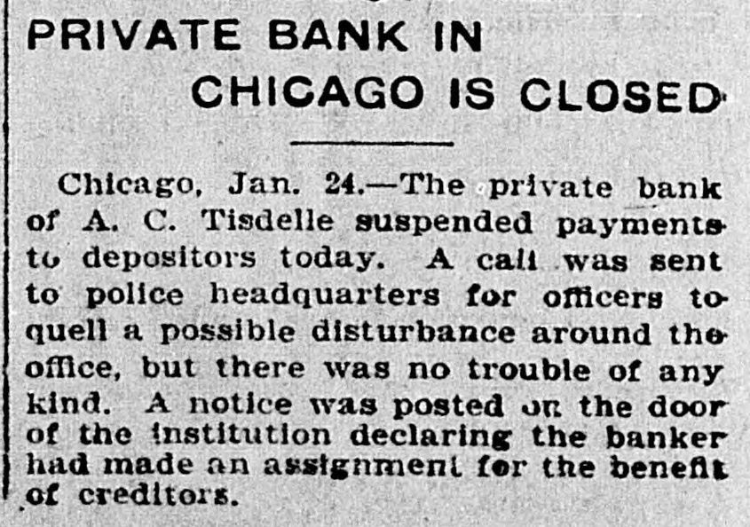 PRIVATE BANK ASSIGNS. A. C. Tisdelle of Chicago, Suspends Payment. Chicago, Jan. --The private bank of A. C. Tisdelle suspended payment to depositors today. A call was sent to police headquarters for officers to quell a possible disturbance around the office, but there was no trouble of any kind. The notice was posted on the door of the institution today declaring that the banker had made an assignment for the benefit of creditors. The liabilities are given at $74,000; assets, $96,000.