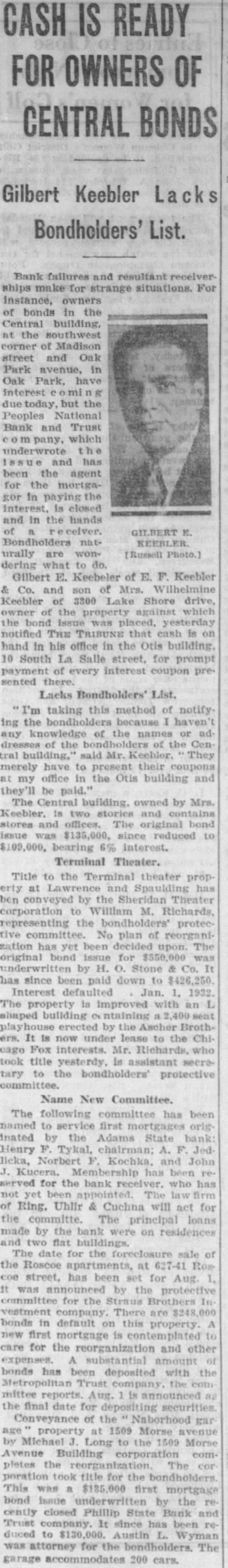 CASH IS READY FOR OWNERS OF CENTRAL BONDS Gilbert Keebler Lacks Bondholders' List. Bank failures and ships make for strange situations. For instance, owners bonds in the Central building. at the southwest corner of Madison street and Oak Park in Oak Park, have interest today but the Peoples National Bank and Trust which underwrote the and has been the agent for the mortgagor In paying the interest, is closed and in the hands of GILBERT naturally are wondering what to Gilbert E. Keebeler of E. F. Keebler & Co. and son of Mrs. Wilhelmine Keebler of 3300 Lake Shore drive, owner of the property which the bond yesterday notified THE TRIBUNE that cash is on hand in his office in the Otis building. 10 South La Salle street, for prompt payment of every interest coupon presented there. Lacks Bondholders' List. I'm taking this method of notify ing the bondholders because haven't any knowledge of the names or adof the of the Central building,' said Mr. Keebler. They merely have to present their at my office in the Otis building and they'll be paid." The Central owned by Mrs. Keebler. is two and stores and offices. The original bond issue was $135,000. since reduced to $109,000, bearing 6% interest. Terminal Theater. Title to the Terminal theater property at and has ben by the Sheridan corporation to William M. Richards, representing the protective No plan of reorganination has yet been upon The original bond issue for $550,000 was by H. O. Stone Co. It has since been paid down to $426,250. Interest defaulted Jan. 1, 1932. The property is improved with an shaped building ntaining a by the Ascher Brothers. It is now under to the Chi cago Fox interests. Mr. Richards. took title yesterdy, is assistant secretary to the bondholders' protective Name New Committee. The following committee has been named to service first mortgages orig inated by the Adams State bank: Henry F. Tykal, chairman; A. F. Jed licka, Norbert F. Kochka, and John been reserved for the bank who has not yet The law firm of Ring. Uhlir & Cuchna will act for the The principal loans made by the bank on and flat The date for the sale of the Roscoe at Ros coe street, has been set for Aug. 1, It was by the protective committee for the Straus Brothers In vestment company. There are 000 bonds in default on this property. new first mortgage is contemplated to care for the reorganization and other expenses. substantial amount bonds has been deposited with the Metropolitan the Aug. is announced the final date for Conveyance of the Naborhood gar age property 1509 Morse by Michael Long to the 1509 Morse Avenue Building completes the The cor poration took title for the bondholders. This was a $185,000 first mortgage bond issue underwritten by the recently closed Phillip State Bank and Trust company. It since has been reduced to $130,000. Austin L. Wyman was attorney for the bondholders. The garage accommodates 200 cars.