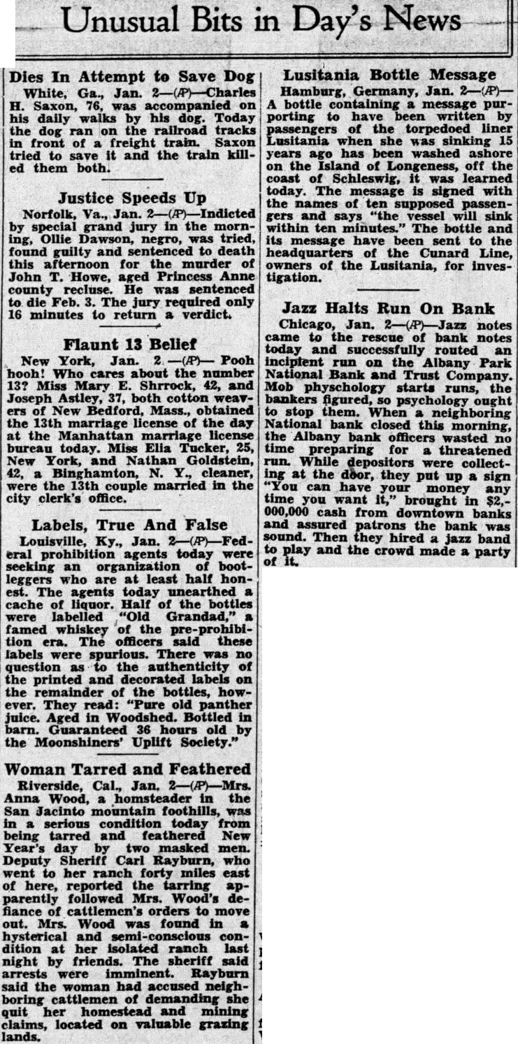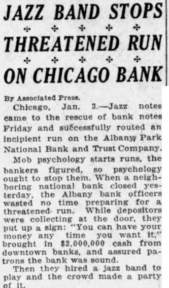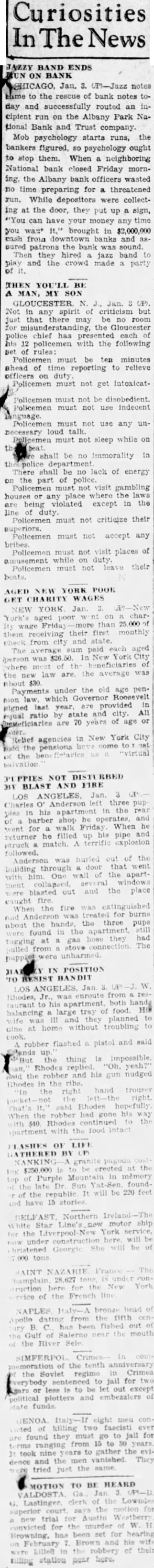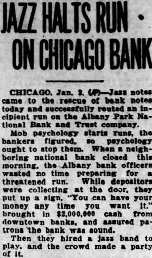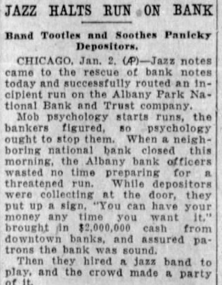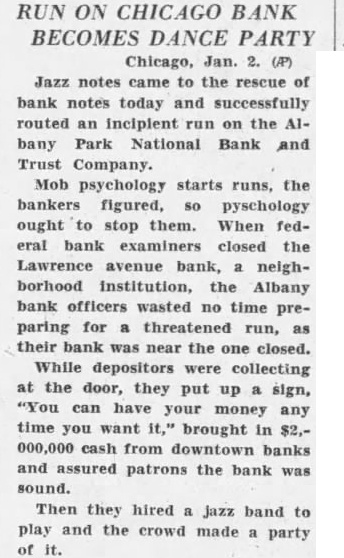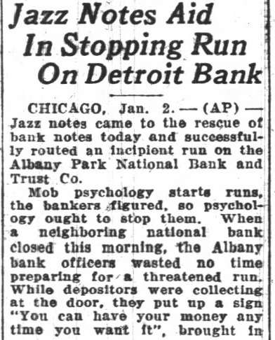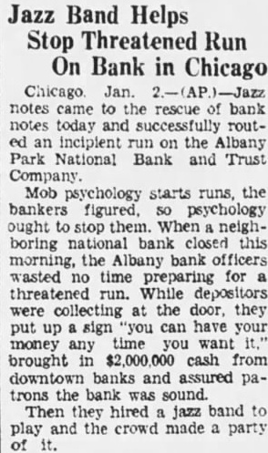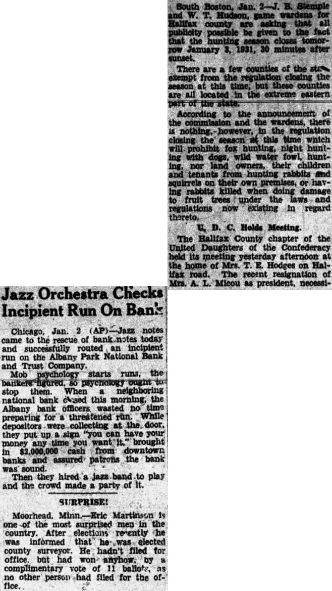 Jazz Orchestra Checks Incipient Run On Bank Chicago, Jan. 2 (AP)-Jazz notes came to the rescue of today and routed an incipient the Albany Park National Bank on and Trust Company. Mob psychology starts the stop them. When neighboring national bank this the Albany bank officers. wasted no time for threatened run. While preparing depositors were collecting at the door. they up sign "you can have your put money any time you want It." brought in $2,000,000 cash from downtown and assured patrons the bank banks was sound. Then they jazz band to play and the crowd made party of It. SURPRISE! one of the most surprised men in the country. After elections recently he was informed that was elected county surveyor. He hadn't filed for office. but had by complimentary vote of 11 ballots, no other person had filed for the office. South Jan. B. Stemple Hudson, game wardens county be the possible that the closes tomorrow January 3, 1931, minutes after sunset. are few counties the exempt from the regulation closing the at time, these counties are located in the extreme eastern of the state. According to the commission and the there is however, the regulation closing the season this time which prohibit fox hunting, night with dogs, wild water fowl, huntnor owners, their children tenants from hunting rabbits and squirrels on their premises, or rabbits killed when doing fruit trees the laws and regulations in regard thereto. D. C. Holds Meeting The Halifax County chapter of the United Daughters of the Confederacy held its meeting yesterday afternoon at the home of Mrs. Hodges on Halifax road. The recent resignation of Mrs. A. L. Micou as president, necessi-