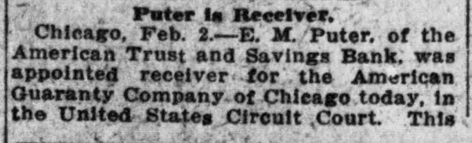 Puter is Receiver, Chicago, Feb. 2.-E. M. Puter. of the American Trust and Savings Bank. was appointed receiver for the American Guaranty Company of Chicago today, in the United States Circuit Court. This