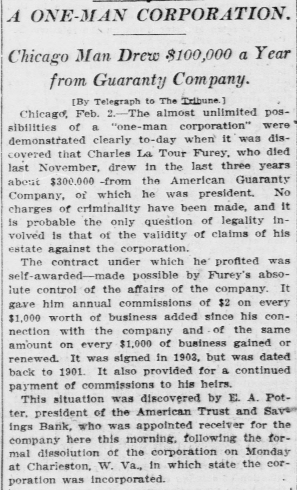 A ONE-MAN CORPORATION. Chicago Man Drew $100,000 a Year from Guaranty Company. [By Telegraph to The Tribune.] Chicago, Feb. 2.-The almost unlimited possibilities of a "one-man corporation" were demonstrated clearly to-day when it was discovered that Charles La Tour Furey, who died last November, drew in the last three years about $300,000 -from the American Guaranty Company, of which he was president. No charges of criminality have been made, and it is probable the only question of legality involved is that of the validity of claims of his estate against the corporation. The contract under which he profited was self-awarded-made possible by Furey's absolute control of the affairs of the company. It gave him annual commissions of $2 on every $1,000 worth of business added since his connection with the company and of the same amount on every $1,000 of business gained or renewed. It was signed in 1903, but was dated back to 1901. It also provided for a continued payment of commissions to his heirs. This situation was discovered by E. A. Potter. president of the American Trust and Save ings Bank, who was appointed receiver for the company here this morning, following the formal dissolution of the corporation on Monday at Charieston, W. Va., in which state the corporation was incorporated.