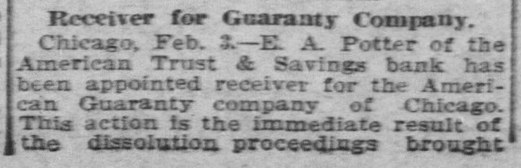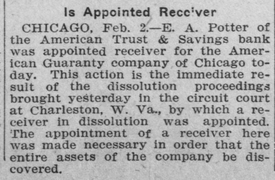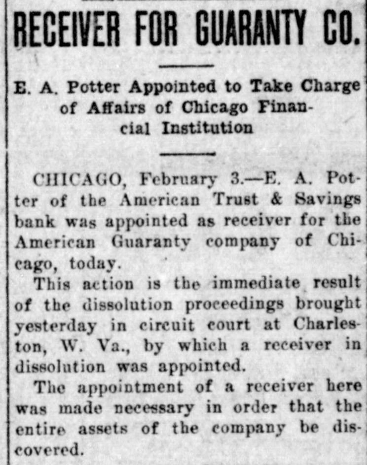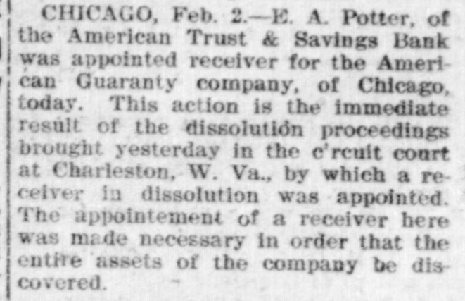 Is Appointed Receiver CHICAGO, Feb. 2.-E. A. Potter of the American Trust & Savings bank was appointed receiver for the American Guaranty company of Chicago today. This action is the immediate result of the dissolution proceedings brought yesterday in the circuit court at Charleston, W. Va., by which a receiver in dissolution was appointed. The appointment of a receiver here was made necessary in order that the entire assets of the company be discovered.