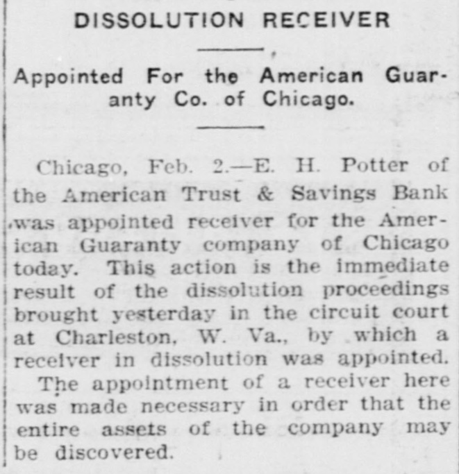 DISSOLUTION RECEIVER Appointed For the American Guaranty Co. of Chicago. Chicago, Feb. 2.-E. H. Potter of the American Trust & Savings Bank was appointed receiver for the American Guaranty company of Chicago today. This action is the immediate result of the dissolution proceedings brought yesterday in the circuit court at Charleston, W. Va., by which a receiver in dissolution was appointed. The appointment of a receiver here was made necessary in order that the entire assets of the company may be discovered.