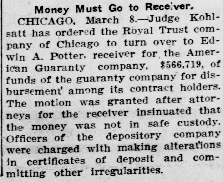Money Must Go to Receiver. CHICAGO, March 8.-Judge Kohlsatt has ordered the Royal Trust company of Chicago to turn over to Edwin A. Potter. receiver for the American Guaranty company, $566,719, of funds of the guaranty company for disbursement' among its contract holders. The motion was granted after attorneys for the receiver insinuated that the money was not in safe custody. Officers of the depository company were charged with making alterations in certificates of deposit and committing other irregularities.