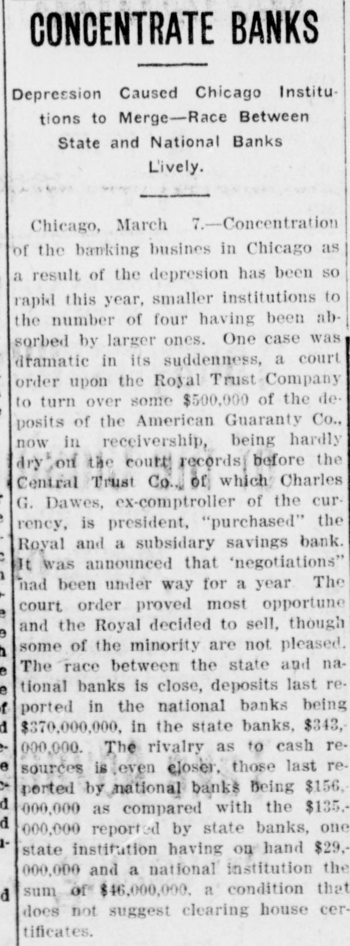 CONCENTRATE BANKS Depression Caused Chicago Institutions to Merge-Race Between State and National Banks Lively. Chicago, March 7.-Concentration of the banking busines in Chicago as a result of the depresion has been so rapid this year, smaller institutions to the number of four having been absorbed by larger ones. One case was dramatic in its suddenness, a court order upon the Royal Trust Company to turn over some $500,000 of the deposits of the American Guaranty Co., now in receivership, being hardly dry on the court records before the Central Trust Co., of which Charles G. Dawes, ex-comptroller of the currency, is president, "purchased" the Royal and a subsidary savings bank. It was announced that "negotiations" nad been under way for a year The court order proved most opportune and the Royal decided to sell, though some of the minority are not pleased. The race between the state and national banks is close, deposits last reported in the national banks being d $370,000,000, in the state banks, $343, 000,000. The rivalry as to cash resources is even eloser, those last reported by national banks being $156, d 000,000 as compared with the $135.d 000,000 reported by state banks, one state institution having on hand $29,000,000 and a national institution the sum of $46,000,000, a condition that does not suggest clearing house certificates.