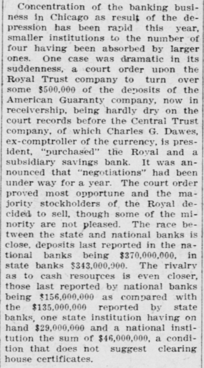 Concentration of the banking business in Chicago as result of the depression has been rapid this year, smaller institutions to the number of four having been absorbed by larger ones. One case was dramatic in its suddenness, a court order upon the Royal Trust company to turn over some $500,000 of the deposits of the American Guaranty company, now in receivership, being hardly dry on the court records before the Central Trust company, of which Charles G. Dawes, ex-comptroller of the currency, is president, "purchased" the Royal and a subsidiary savings bank. It was announced that "negotiations" had been under way for a year. The court order proved most opportune and the majority stockholders of the Royal decided to sell, though some of the mimority are not pleased. The race between the state and national banks is close, deposits last reported in the national banks being $370,000,000. in state banks $343,000,000. The rivalry as to cash resources is even closer, those last reported by national banks being $156,000,000 as compared with the $135,000,000 reported by state banks, one state institution having on hand $29,000,000 and a national institution the sum of $46,000,000. a condition that does not suggest clearing house certificates.