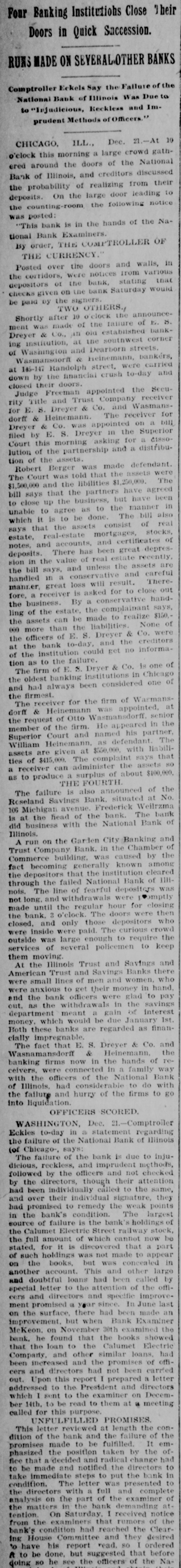 Four Banking Institutions Close Their Doors in Quick Succession. RUNS MADE ON SEVERALOTHER BANKS Comptroller Eckels Say the Failure of the National Bank of Illinois Was Due to to "Injudicious, Reckless and Imprudent Methods of Officers.' CHICAGO, ILL., Dec. 21.-At 10 o'clock this morning a large crowd gathered around the doors of the National Bank of Illinois, and creditors discussed the probability of realizing from their deposits. On the large door leading to the counting-room the following notice was posted: "This bank is in the hands of the National Bank Examiners. By order, THE COMPTROLLER OF THE CURRENCY. Posted over tire doors and walls, in the corridors, were notices from various depositors or the bank, stating that checks given on the bank Saturday would be paid by the signers. TWO OTHERS., Shortly after 10 o'clock the announcement was made of the failure of E. S. Dreyer & Co., in ORI established banking institution, at the southwest corner of Washington and Dearborn streets. Wasmansdorft & Heinemann, bankers, at 146-147 Randolph street, were carried down by the financial crush to-day and closed their doors. Judge Freeman appointed the Security Title and Trust Company receiver for E. S. Dreyer & Co. and Wasmansdorff & Heinemann. The receiver for Dreyer & Co. was appointed on a bill filed by E. S. Dreyer in the Superior Court this morning asking for a Cissolution of the partnership and a distribution of the assets. Robert Berger was made defendant. The Court was told that the assets were $1,500,000 and the libilities $1,250,000. The bill says that the partners have agreed to close up the business, but have been unable to agree as to the manner in which it is to be done. The bill also says that the assets consist of real estate, real-estate mortgages, stocks, notes, and accounts, and certificates of deposits. There has been great depression in the value of real estate recently, the bill says, and unless the assets are handled in a conservative and careful manner, great loss will result. Therefore, a receiver is asked for to close out the business. By a conservative handling of the estate, the complainant says, the assets can be made to realize $150, 000 more than the liabilities. None of the officers of E. S. Dreyer & Co. were at the bank to-day, and the creditors of the institution could get no information as to the failure. The firm of E. 3. Dryer & Co. is one of the oldest banking institutions in Chicago and had always been considered one of the firmest. The receiver for the firm of Wasmansdorff & Heinemann was appointed, at the request of Otto Wasmansdorff, senior member of the firm. He appeared in the Superior Court and named his partner, William Heinemann. as defendant. The assets are given at $550,000. with Habilities of $415,000. The complaint says that a receiver can administer the assets so as to produce a surplus of about $100,000. THE FOURTH. The failure is also announced of the Roseland Savings Bank. situated at No. 106 Michigan avenue. Frederick Weilrzma is at the head of the bank. The bank did business with the National Bank of Illinois. A run on the Garden City Banking and Trust Company Bank. in the Chamber of Commerce building. was caused by the fact becoming generally known among the depositors that the institution cleared through the failed National Bank of IIIInois. The line of fearful depositers was not long. and withdrawals were (Comptly made until the regular hour for closing the bank. 3 o'clock. The doors were then closed. and only those depositors who were inside were paid. The curious crowd outside was large enough to require the services of several policemen to keep them moving. At the Illinois Trust and Savings and American Trust and Savings Banks there were small lines of men and women. who were anxious to get their money in hand. and the bank officers were glad to pay out. as the withdrawals in the savings department meant gain of interest money. which would be due January 1st. Both these banks are regarded as financially impregnable. The fact that E. S. Dreyer & Co. and Wasnamansdorff & Heinemann. the banking firms now in the hands of receivers. were connected in a family way with the officers of the National Bank of Illinois. had considerable to do with the failure and hurry of the firms to go into liquidation. OFFICERS SCORED. WASHINGTON, Dec. 21.-Comptroller Eckles to-day in a statement regarding the failure of the National Bank of Illinois (of Chicago-, says: The failure of the bank is due to injudiclous, reckless, and imprudent methods, followed by the officers and not checked by the directors, though their attention had been individually called to the same, and over their individual signature, they had promised to remedy the weak points in the bank's condition. The largest source of failure is the bank's holdings of the Calumet Electric Street railway stock, the full amount of which cannot now be stated, for it is discovered that a part of such holdings was not made to appear on the books, but was concealed in another account. This and other large and doubtful loans had been called by special letter to the attention of the officers and directors and specific improvement promised year since. In June last on the surface. there had been made an improvement, but when Bank Examiner McKeon. on November 30th examined the bank. he found that the books showed that the loan to the Calumet Electric Company, and other similar loans, had been increased and the promises of officers and directors had not been carried out. Upon this report prepared a letter addressed to the President and directors which sent to the examiner on December 14th. to be read to them at a meeting called for this purpose. UNFULFILLED PROMISES. This letter reviewed at length the condition of the bank and the failure of the promises made to be fulfilled. It emphasized the position taken by the office that decided and radical change had to be made and notified the directors to take immed