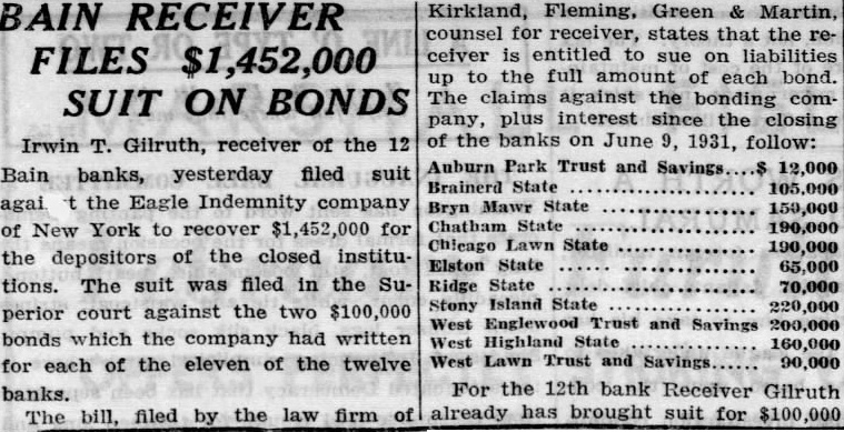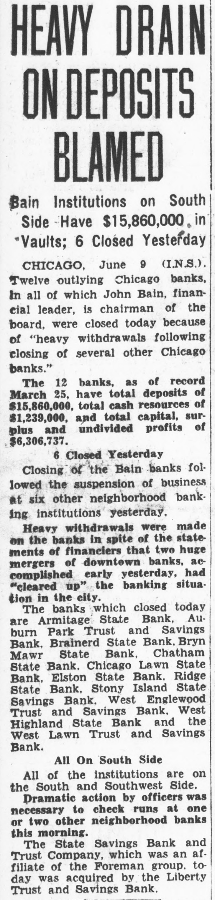 HEAVY DRAIN ON DEPOSITS BLAMED Bain Institutions on South Side Have $15,860,000 e in "Vaults; 6 Closed Yesterday CHICAGO, June 9 (I.N.S.). I welve outlying Chicago banks, In all of which John Bain, financial leader, is chairman of the board, were closed today because of "heavy withdrawals following closing of several other Chicago banks." The 12 banks, as of record March 25, have total deposits of $15,860,000, total cash resources of $1,239,000, and total capital, surplus and undivided profits of $6,306,737. 6 Closed Yesterday Closing of the Bain banks followed the suspension of business at six other neighborhood banking institutions yesterday. Heavy withdrawals were made on the banks in spite of the statements of financiers that two huge mergers of downtown banks, accomplished early yesterday, had "cleared up" the banking situa. tion in the city. The banks which closed today are Armitage State Bank, Auburn Park Trust and Savings Bank, Brainerd State Bank, Bryn Mawr State Bank, Chatham State Bank. Chicago Lawn State Bank, Elston State Bank, Ridge State Bank. Stony Island State Savings Bank. West Englewood Trust and Savings Bank. West Highland State Bank and the West Lawn Trust and Savings Bank. All On South Side All of the institutions are on the South and Southwest Side. Dramatic action by officers was necessary to check runs at one or two other neighborhood banks this morning. The State Savings Bank and Trust Company, which was an affiliate of the Foreman group. today was acquired by the Liberty Trust and Savings Bank.
