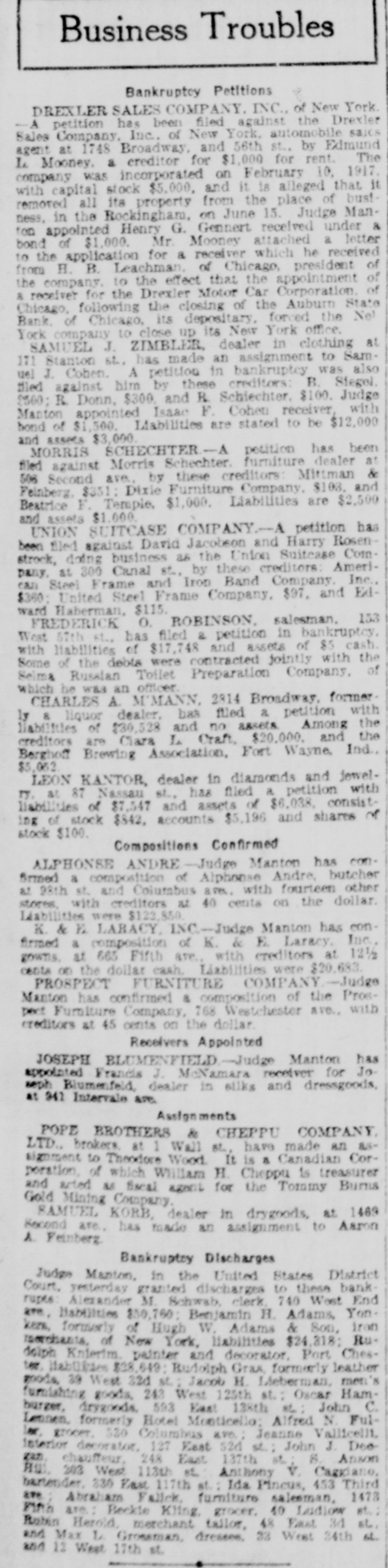 Business Troubles Bankruptcy Petitions DREXLER SALES COMPANY. INC., of New York A petition has been filed against the Drexler Sales Company, Inc., of New York, automobile sajes agent at 1748 Broadway, and 56th st., by Edmund L Mooney, a creditor for $1,000 for rent. The company was incorporated on February 10. 1917. with capital stock $5,000, and it is alleged that it removed all its property from the place of bustness, in the Rockingham, on June 15. Judge Manton appointed Henry G. Gennert received under & bond of $1,000. Mr. Mooney attached a letter to the application for a receiver which he received from H. B. Leachman, of Chicago, president of the company, to the effect that the appointment of 8 receiver for the Drexler Motor Car Corporation. of Chicago, following the closing of the Auburn State Bank. of Chicago, its depositary, forced the Ne! York company to close up its New York office. SAMUEL J. ZIMBLER, dealer in clothing at 171 Stanton sh, has made an assignment to Samuel J. Cohen. A petition in bankruptcy was also filed against him by these creditors: B. Siegel, 2500; R. Donn, $300, and R. Schiechter. $100. Judge Manton appointed Isaac F. Cohen receiver, with bond of $1,500. Liabilities are stated to be $12,000 and assets $3,000. MORRIS SCHECHTER.-A petition has been filed against Morris Schechter. furniture dealer at 508 Second ave., by these creditors Mittman & Feinberg, $351: Dixie Furniture Company, $103. and Beatrice F. Temple, $1,000. Liabilities are $2,500 and assets $1,000. UNION SUITCASE COMPANY.-A petition has been filed against David Jacobson and Harry Rosenstrock, doing business as the Union Suitcase Company, at 300 Canal st., by these creditors: American Steel Frame and Iron Band Company. Inc., $360: United Steel Frame Company, $97, and Edward Haberman, $115. FREDERICK O. ROBINSON, salesman, 153 West 57th st., has filed a petition in bankruptcy, with liabilities of $17,748 and assets of $5 cash. Some of the debta were contracted jointly with the Selma Russian Toilet Preparation Company, of which be was an officer CHARLES A. M'MANN, 2814 Broadway, formerly & liquor dealer, bas filed a petition with liabilities of $30,528 and no assets Among the creditors are Clara L Craft, $20,000. and the Berghoff Brewing Association, Fort Wayne, Ind., $5,052 LEON KANTOR, dealer in diamonds and jewelΓy. at 87 Nassau st., has filed a petition with liabilities of $7,547 and assets of $6,038, consisting of stock $842, accounts $5,196 and shares of stock $100. Compositions Confirmed ALPHONSE ANDRE-Judge Manton has confirmed a composition of Alphonse Andre, butcher at 98th st. and Columbus are. with fourteen other stores. with creditors at 40 cents on the dollar. Liabilities were $122,850. K. & K. LARACY INC-Judge Manton has confirmed a composition of K. & E. Laracy, Inc. gowns. at 665 Fifth are., with creditors at 12½ cents on the dollar cash. Liabilities were $20,683. PROSPECT FURNITURE COMPANY -Judge Manton has confirmed & composition of the Prospect Furniture Company, 768 Westchester are., with creditors at 45 cents on the dollar. Receivers Appointed JOSEPH BLUMENFIELD.-Jud Manton has appointed Francis J. McNamara receiver for Joseph Blumenfeld, dealer in silks and dressgoods, at 941 Intervale are Assignments POPE BROTHERS & CHEPPU COMPANY, LTD., brokers. at 1 Wall 8L, have made an assignment to Theodore Wood. It is a Canadian Corporation of which William H. Cheppu is treasurer and acted as fiscal agent for the Tommy Burns Gold Mining Company. SAMUEL KORB, dealer in drygoods, at 1469 Second are., has made an assignment to Aaron A. Feinberg. Bankruptcy Discharges Judge Manton, in the United States District Court, yesterday granted discharges to these bank. rupte Alexander M Schwab. clerk 740 West End are, liabilities $50,760: Benjamin H. Adams, Yonkera, formarly of Hugh W. Adams & Son, iron merchants, of New York, liabilities $24,318; Rudelph Knierim, painter and decorator, Port Chester, Habilikies $28,649; Budolph Gras, formerly leather goods, 39 West 32d st.: Jacob H. Lieberman, men's furnishing goods, 243 West 125th st.: Oscar Hamburger, drygoods, 593 East 138th #2; John C. Lennen, formerly Hotel Monticello: Alfred N Fulm, grocer, 530 Columbus ave.; Jeanne Vallicellt. interior decorator, 127 East 52d st.: John J. Deezan. chauffeur, 248 East 137th oh; 8 Anson 203 West 113th st. Anthony V. Caggiano, bartender. 330 Fax 117th at. Ida Pincus, 453 Third are Abraham Fallck, furniture salesman, 1473 Fina are: Beckie Kling, grocer. 40 Ludiow st.: Roben Herold, merchant tailor, 48 East 3d st, and Max L Grossman, dreases, 33 West 34th 6L. and 12 West 17th st.