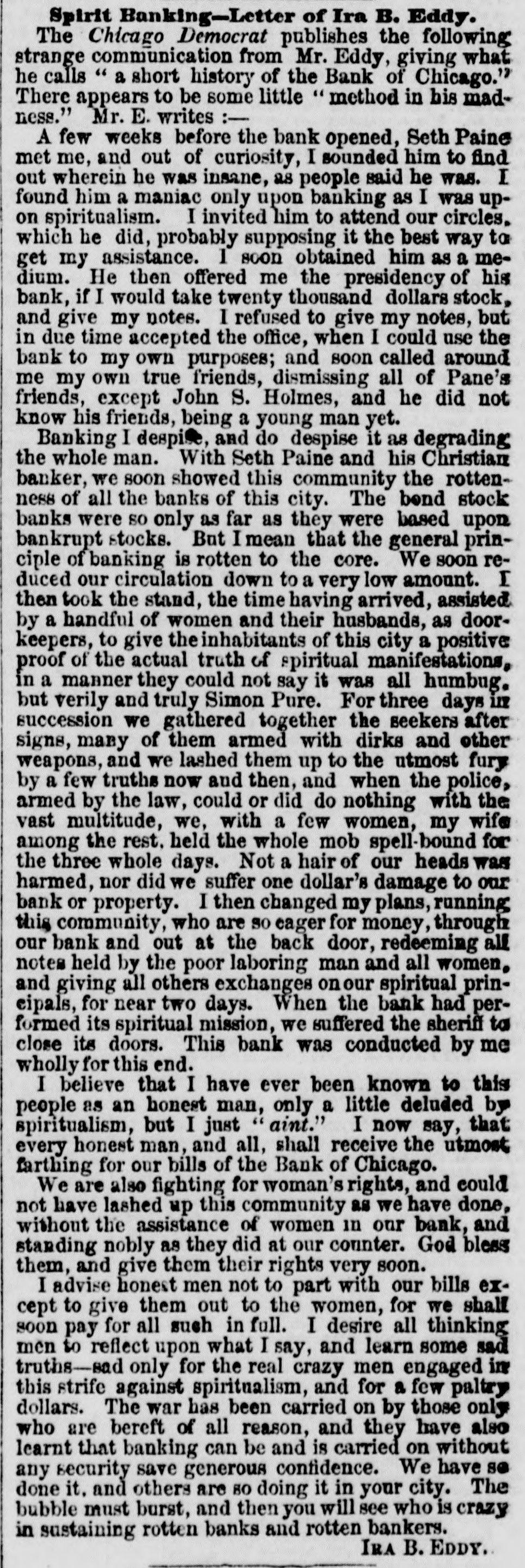 # Spirit Banking-Letter of Ira B. Eddy. The Chicago Democrat publishes the following strange communication from Mr. Eddy, giving what he calls " a short history of the Bank of Chicago." There appears to be some little "method in his madness." Mr. E. writes :- A few weeks before the bank opened, Seth Paine met me, and out of curiosity, I sounded him to find out wherein he was insane, as people said he was. I found him a maniac only upon banking as I was upon spiritualism. I invited him to attend our circles. which he did, probably supposing it the best way to get my assistance. I soon obtained him as a medium. He then offered me the presidency of his bank, if I would take twenty thousand dollars stock, and give my notes. I refused to give my notes, but in due time accepted the office, when I could use the bank to my own purposes; and soon called around me my own true friends, dismissing all of Pane's friends, except John S. Holmes, and he did not know his friends, being a young man yet. Banking I despise, and do despise it as degrading the whole man. With Seth Paine and his Christian banker, we soon showed this community the rottenness of all the banks of this city. The bond stock banks were so only as far as they were based upon bankrupt stocks. But I mean that the general principle of banking is rotten to the core. We soon reduced our circulation down to a very low amount. I then took the stand, the time having arrived, assisted by a handful of women and their husbands, as doorkeepers, to give the inhabitants of this city a positive proof of the actual truth of spiritual manifestations, in a manner they could not say it was all humbug. but verily and truly Simon Pure. For three days in succession we gathered together the seekers after signs, many of them armed with dirks and other weapons, and we lashed them up to the utmost fury by a few truths now and then, and when the police, armed by the law, could or did do nothing with the vast multitude, we, with a few women, my wife among the rest, held the whole mob spell-bound for the three whole days. Not a hair of our heads was harmed, nor did we suffer one dollar's damage to our bank or property. I then changed my plans, running this community, who are so eager for money, through our bank and out at the back door, redeeming all notes held by the poor laboring man and all women, and giving all others exchanges on our spiritual principals, for near two days. When the bank had per-formed its spiritual mission, we suffered the sheriff to close its doors. This bank was conducted by me wholly for this end. I believe that I have ever been known to this people as an honest man, only a little deluded by spiritualism, but I just "aint." I now say, that every honest man, and all, shall receive the utmost farthing for our bills of the Bank of Chicago. We are also fighting for woman's rights, and could not have lashed up this community as we have done, without the assistance of women in our bank, and standing nobly as they did at our counter. God bless them, and give them their rights very soon. I advise honest men not to part with our bills ex-cept to give them out to the women, for we shall soon pay for all such in full. I desire all thinking men to reflect upon what I say, and learn some sad truths-sad only for the real crazy men engaged in this strife against spiritualism, and for a few paltry dollars. The war has been carried on by those only who are bereft of all reason, and they have also learnt that banking can be and is carried on without any security save generous confidence. We have so done it, and others are so doing it in your city. The bubble must burst, and then you will see who is crazy in sustaining rotten banks and rotten bankers. IRA B. EDDY.