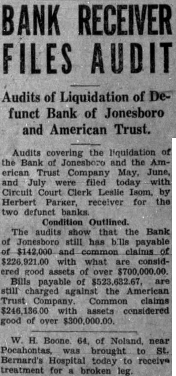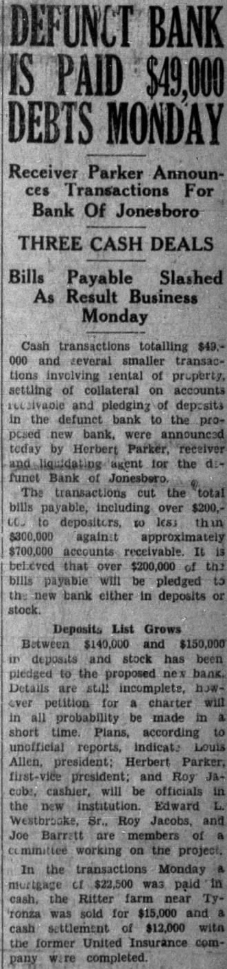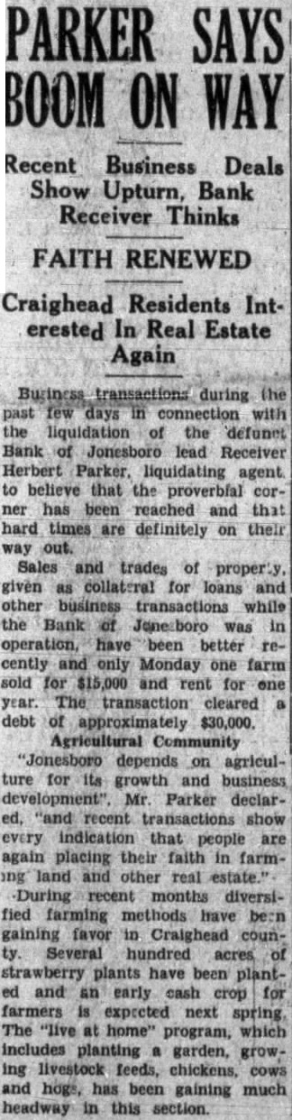 PARKER SAYS BOOM ON WAY Recent Business Deals Show Upturn, Bank Receiver Thinks FAITH RENEWED Craighead Residents Interested In Real Estate Again Business transactions during the past days connection with the liquidation of the defunct Bank of Jonesboro lead Receiver Herbert Parker, liquidating agent to believe that the proverbial corner has been reached and that hard times are definitely on their way out. Sales and trades of given as collateral for loans and other business transactions while the Bank of Jonesboro was in operation, have been better recently and only Monday one farm sold for $15,000 and rent for one year. The transaction cleared debt of approximately $30,000. Agricultural Community "Jonesboro depends on agriculture for its growth and business development", Mr. Parker declared, and recent transactions show every indication that people are again placing their faith in farming land other real estate." During recent months diversified farming methods have been gaining favor in Craighead county. Several hundred acres of strawberry plants have been planted and an early cash crop for farmers expected next spring The "live at home" program, which includes planting garden, growing livestock feeds, chickens, cows and hogs, has been gaining much headway in this section.