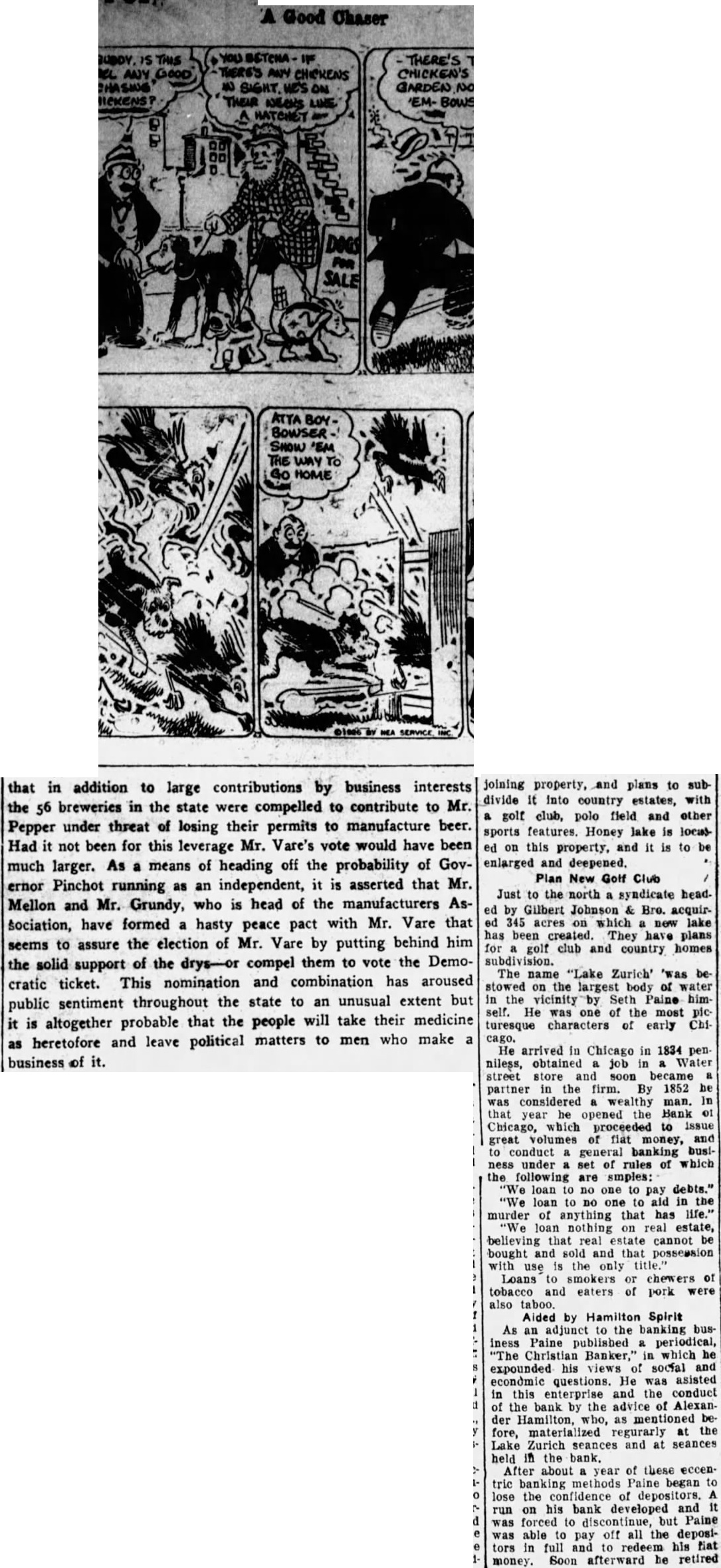 A Good Chaser that in addition to large contributions by business interests the 56 breweries in the state were compelled to contribute to Mr. Pepper under threat of losing their permits to manufacture beer. Had it not been for this leverage Mr. Vare's vote would have been much larger. As a means of heading off the probability of Governor Pinchot running as an independent, it is asserted that Mr. Mellon and Mr. Grundy, who is head of the manufacturers Association, have formed a hasty peace pact with Mr. Vare that seems to assure the election of Mr. Vare by putting behind him the solid support of the drys-or compel them to vote the Democratic ticket. This nomination and combination has aroused public sentiment throughout the state to an unusual extent but it is altogether probable that the people will take their medicine as heretofore and leave political matters to men who make a business of it. joining property, and plans to subdivide It into country estates, with a golf club, polo field and other sports features. Honey lake is localed on this property, and it is to be enlarged and deepened. Plan New Golf Club Just to the north a syndicate head. ed by Gilbert Johnson & Bro. acquired 345 acres on which a new lake has been created. They have plans for a golf club and country homes subdivision. The name "Lake Zurich' 'was bestowed on the largest body of water in the vicinity by Seth Paine himself. He was one of the most pic turesque characters of early Chicago. He arrived in Chicago in 1834 penniless, obtained a job in a Water street store and soon became partner in the firm. By 1852 be was considered wealthy man. In that year he opened the Bank 01 Chicago, which proceeded to issue great volumes of flat money, and to conduct a general banking business under a set of rules of which the following are smples: "We loan to no one to pay debts." "We loan to no one to aid in the murder of anything that has life." "We loan nothing on real estate, believing that real estate cannot be bought and sold and that possession with use is the only title." Loans to smokers or chewers of tobacco and eaters of pork were also taboo. Aided by Hamilton Spirit As an adjunct to the banking business Paine published a periodical, "The Christian Banker," in which he expounded his views of social and economic questions. He was asisted in this enterprise and the conduct of the bank by the advice of Alexander Hamilton, who, as mentioned be fore, materialized regurarly at the Lake Zurich seances and at seances held in the bank. After about a year of these eccentric banking methods Paine began to lose the confidence of depositors. A run on his bank developed and it was forced to discontinue, but Paine was able to pay off all the depositors in full and to redeem his fiat money. Soon afterward he retired