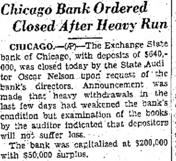 Chicago Bank Ordered Closed After Heavy Run bank of Chicago, with deposits of $640,000, was closed today by the State Audi tor Oscar Nelson upon request of the bank's directors. Announcement was made that heavy withdrawals in the last few days had weakened the bank's condition but examination of the books by the auditor indicated that depositors will not suffer loss. The bank was capitalized at $200,000 with $50,000 surplus.