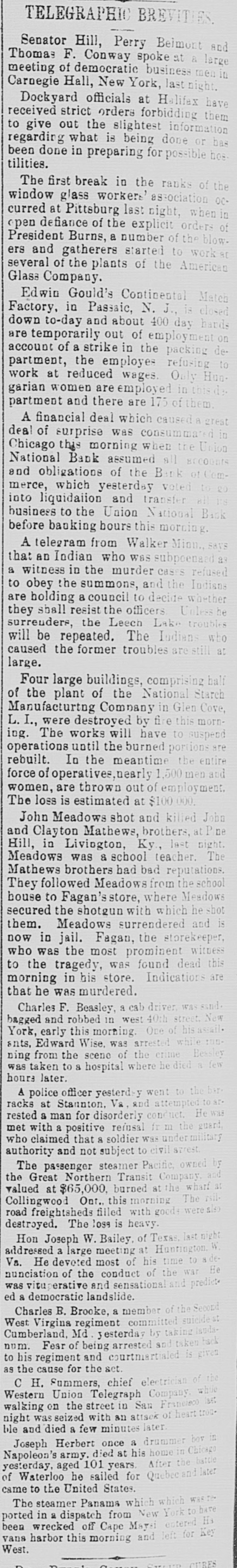 TELEGRAPHIC BREVITIES Senator Hill, Perry Beimont and Thomas F. Conway spoke at a large of men Carnegie meeting Hall, democratic New York, business last night. Dockyard officials at Halifax have received strict orders forbidding them to give out the slightest information regarding what is being done or bas been done in preparing for possible hos tilities. The first break in the ranks of the window glass workers' association OCcurred at Pittsburg last night, when in open defiance of the explicit orders of President Burns, a number of the blow. ers and gatherers started to work several of the plants of the American Glass Company. Edwin Gould's Continental Match Factory, in Passaic, N. J.. is closed down to-day and about 400 day hards are temporarily out of employment on account of a strike in the packing department, the employes refusing to work at reduced wages. Only Hungarian women are employed in this partment and there are 175 of them A financial deal which caused A great in deal of surprise was consummated Chicago this morning when the all 8000 National Bank assumed of and obligations of the Bank merce, which yesterday voted into liquidation and transfer business to the Union National Back before banking hours this morning. A telegram from Walker Mion. that AD Indian who was subpoenaed a witness in the murder cases refused to obey the summons, and the Indians are holding a council to decide whether they shall resist the officers Unless surreuders, the Leech Lake troubles will be repeated. The Indians who caused the former troubles are still at large. Four large buildings, comprising half of the plant of the National Starch Manufacturting Company in Glen Cove, L. I., were destroyed by fire this morning. The works will have to suspend operations until the burned portions are rebuilt. In the meantime the entire force of operatives, nearly 1.500 men and women, are thrown out of employment. The loss is estimated at $100 000. John Meadows shot and killed Joba Mathews, brothers, at P ne was a school and Meadows Hill, Clayton in Livington, Ky., teacher. last night. The brothers had bad reputations. followed Meadows from They Mathews the Meadows school to store, where shotgun with secured house the Fagan's which he shot is Meadows surrendered and in Fagan, the now them. jail. storekeeper, witness who was the most prominent was in his store. are morning to the tragedy, found Indications dead this that he was murdered. Charles F. Beasley, a cab driver, was sand. bagged and robbed in west 40th street. assail New York, early this morning. One of while his ants. Edward Wise. was arrested Bessley few ning from the scene of the crime a was taken to a hospital where he died hours later. A police officer yesterday went to the bir racks at Stannton. Va and attempted He was a man for disorderly conduct. a refusal fr m who that 8 soldier was rested met with claimed positive undermilitary the guard and not subject to steamer authority The passenger Pacific, civil strest owned the Great Northern Transit Company valued at $65,000. burned at the The wharf Collingwood Ont. this morning were road freightsheds filled with good destroyed. The loss is heavy. W. Bailey, of Texas last night W addressed a large meeting at Vs. He devoted most of his Hon Joseph Huntington time to 8 de He nunciation of the conduct of the war was vituperative and sensational and predict ed a democratic landslide. B. Brooke, a member regiment West Charles Virgina committed taking lauds of the suicidest Second Cumberland, Md. yesterday by Fear of being arrested given to and num. his regiment courtniartialed and taken is back as the cause for the act. the C H. summers, chief electrician of while Union Telegraph Company last on the street in San 1100+ was seized with an attack walking night Western later Francisco of heart ble and died a few minutes Herbert once a in Chicago army. died at his Joseph drummer home the boy aged 101 years. he sailed for of yesterday, Napoleon's Waterloo Quebec After and battle later came to the United States. The steamer Panama which which to W85 ported in 2 dispatch from New York entered H3 been wrecked off Cape Mayai left for Key vans harbor this morning and West.