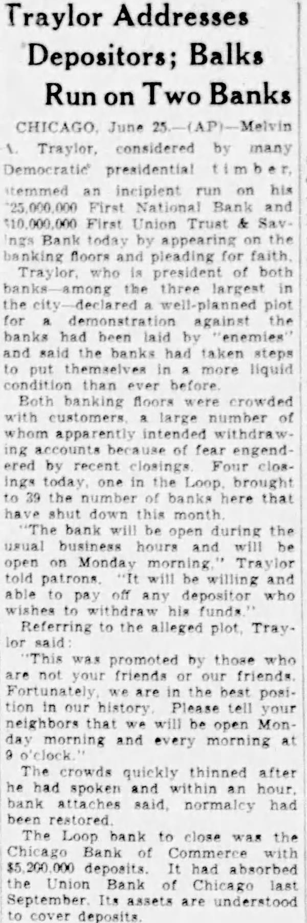 Traylor Addresses Depositors; Balks Run on Two Banks CHICAGO June Melvin Traylor, considered by many presidential itemmed an on his First First Union Trust Sav ngs and pleading for faith. who is president of both the three largest the for demonstration against the had been laid and the had taken steps to put more liquid than Both crowded large number of intended withdraw ing fear ered by recent closings Four ings today one brought to the here this bank will during the usual and will open on Monday morning Traylor told will be willing and off any depositor who to alleged plot. Traysaid This promoted by those are not your friends friends Fortunately are the best posiin our history Please tell your neighbors will open Mon day morning and every morning at The thinned after had spoken and an bank attaches had been restored The Loop bank close was the Bank of Commerce with had absorbed the Bank of last September assets are understood deposits