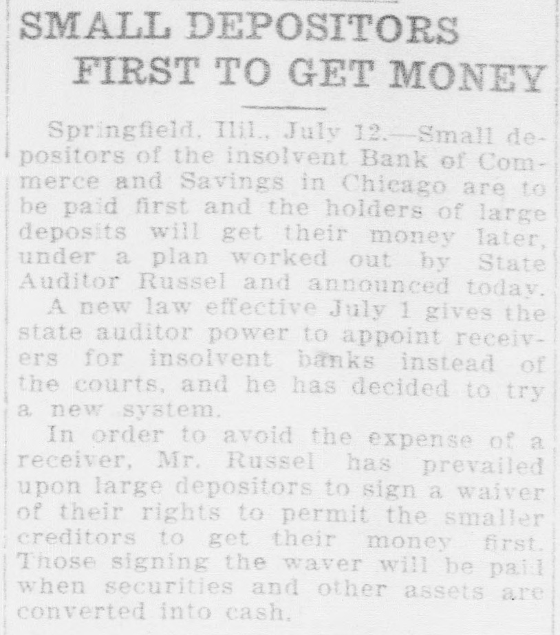 SMALL DEPOSITORS FIRST TO GET MONEY Springfield, Ilil., July 12.-Small depositors of the insolvent Bank of Commerce and Savings in Chicago are to be paid first and the holders of large deposits will get their money later, under a plan worked out by State Auditor Russel and announced today. A new law effective July 1 gives the state auditor power to appoint receivers for insolvent banks instead of the courts, and he has decided to try a new system. In order to avoid the expense of a receiver, Mr. Russel has prevailed upon large depositors to sign a waiver of their rights to permit the smaller creditors to get their money first. Those signing the waver will be pail when securities and other assets are converted into cash.