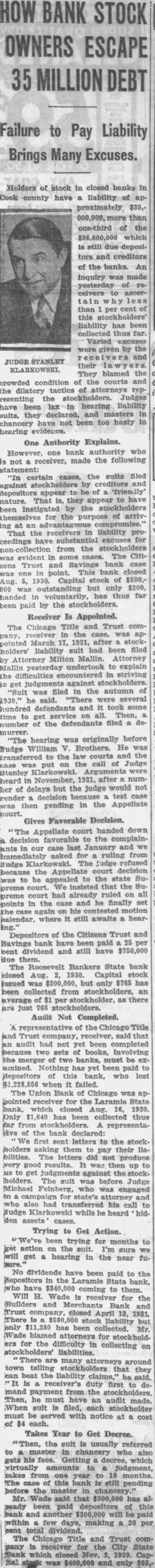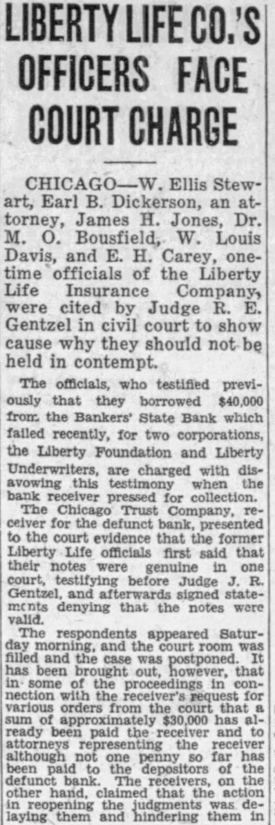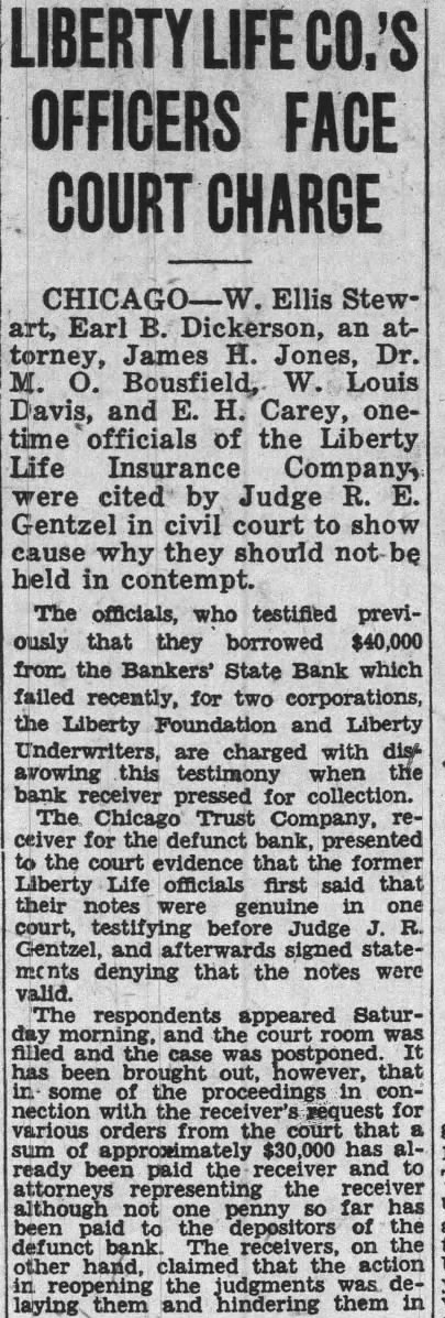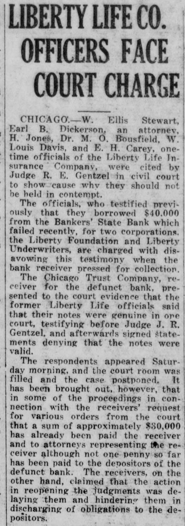 Ellis Earl B. Dickerson, H Jones, Dr. M. Bousfield, W Louis Davis, and E. H Carey, onetime officials of the Liberty Life In surance were cited by Judge R. E. Gentzel in civil court to cause why they should not held in The officials, who testified previously that they from the Bankers' State Bank which failed recently. for two corporations. the Liberty Foundation and Liberty Underwriters, are charged with disavowing this testimony when the bank receiver pressed for collection. The Chicago Trust Company, receiver the defunct bank, presented to the court evidence that the former Liberty Life officials said that their notes were genuine in one court, testifying before Judge J. R. Gentzel, and afterwards signed statements denying that the notes were valid. The respondents appeared Satur day morning, and the court room filled and the case postponed. has been brought out, however, that in some of the proceedings in connection with the receivers' request for various orders from the court that sum of approximately $30,000 has already been paid the receiver and to attorneys representing the ceiver although not one penny far has been paid to the depositors of the defunct bank The receivers, on the other hand. claimed that the action in reopening the judgments was delaying them and hindering them in discharging of obligations to the depositors.