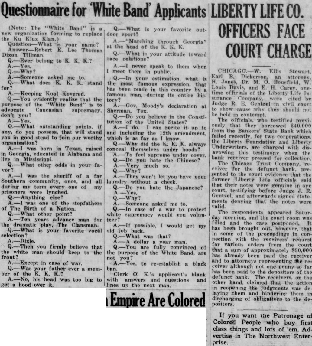 A.-Someone asked me to. does K. K. K. stand for? Kool Kovered. evidently realize that the purpose of the "White Band" is to advocate Caucasian supremacy, don't you? outstanding points, if any, do you possess, that will stand you in good stead to join our worthy organization? A.-1 was born in Texas, raised in Georgia, educated in Alabama and live in Mississippi. other odds in your fa- was the sheriff of a far Southern community, once, and all during my term every one of my prisoners were lynched. else? was one of the stepfathers of The Birth of a Nation. other point? years advance man for the dramatic play, The Clansman. is your favorite vocal selection? you firmly believe that the white man should keep to the front? in case of war. your father ever member of the K. K.? his head was too big to get a hood over it. never speak to them when meet them in public. your estimation, what is the most famous expression. that has been made in this country by famous man, during its entire history? Moody's declaration at Sherman, Tex. you believe in the Constitution of the United States? can recite it up to and including the 12th amendment, which as far as know. did the K. K. K. always conceal themselves under hoods feel supreme under cover. you hate the Chinese? A.-Very much won't let you have your laundry without check. you hate the Japanese? A.-Someone asked me to. case war to protect white supremacy would you volunteer? possible, would get my old job back. was that? dollar year man. are fully convinced of the purpose of the White Band, are not you? to re-establish a black ban. Clerk O. K.'s applicant's blank with answers and questions and lines up the next man.
