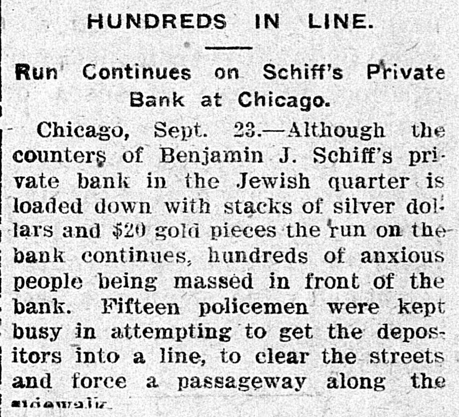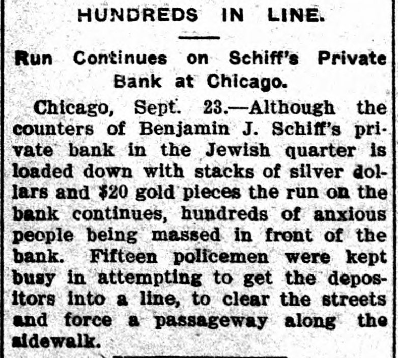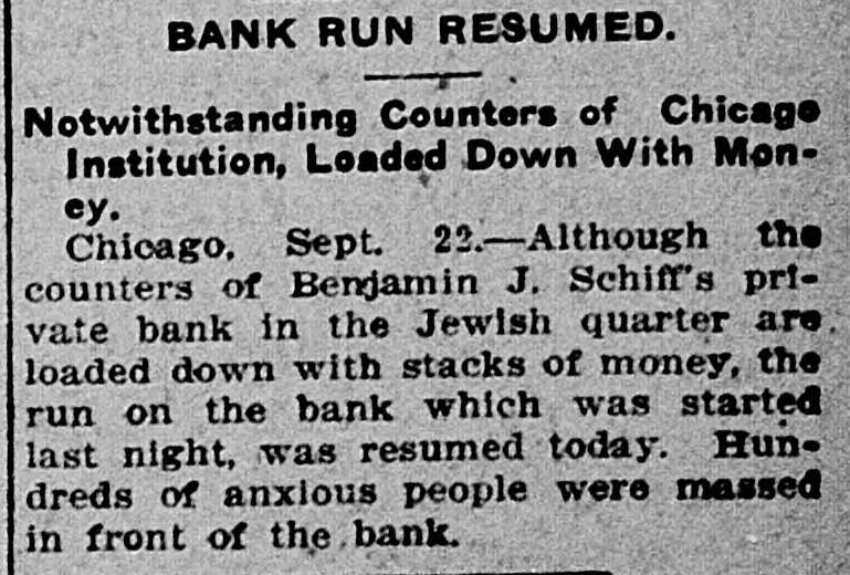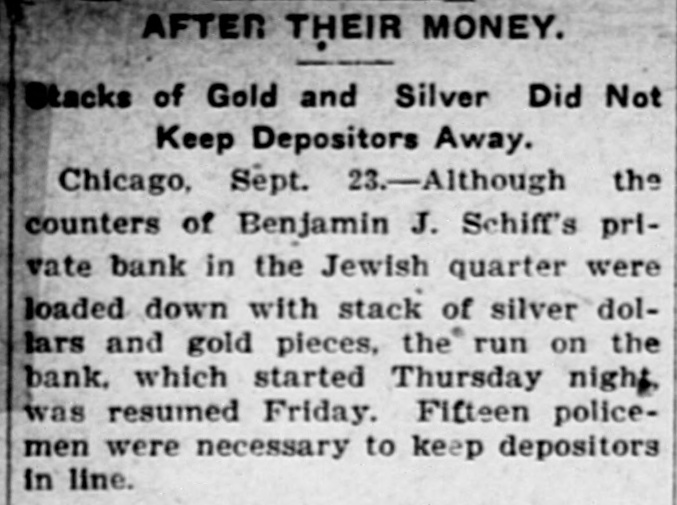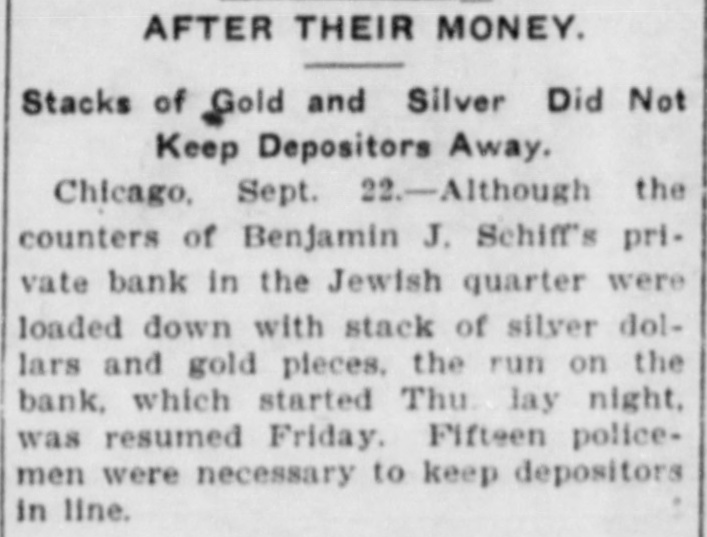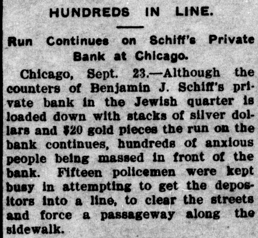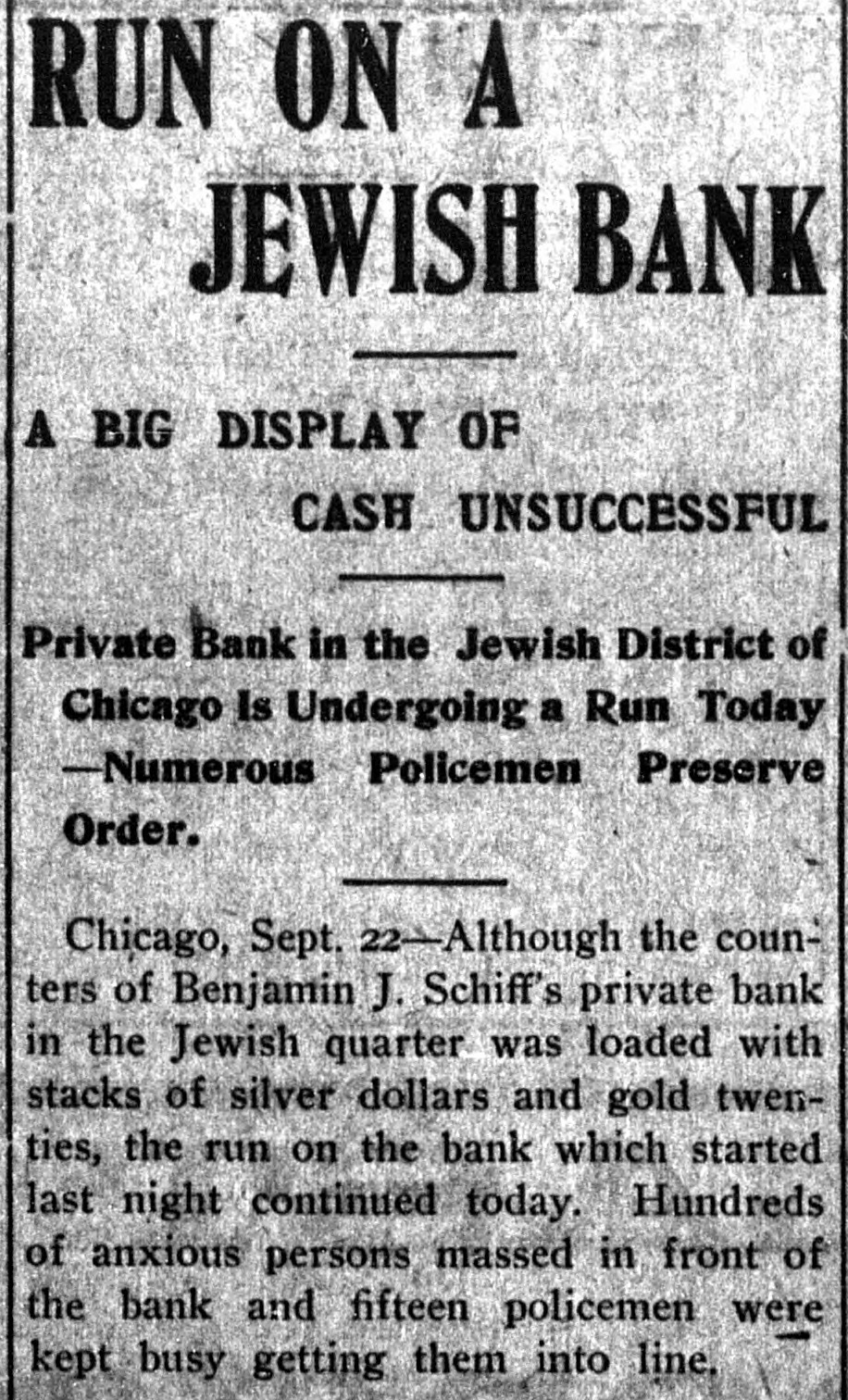 RUN ON A JEWISH BANK BIG DISPLAY OF CASH UNSUCCESSFUL Private Bank in the Jewish District of Chicago Is Undergoing a Run Today -Numerous Policemen Preserve Order. Chicago, Sept. 22-Although the counters of Benjamin J. Schiff's private bank in the Jewish quarter was loaded with stacks of silver dollars and gold twenties, the run on the bank which started last night continued today. Hundreds of anxious persons massed in front of the bank and fifteen policemen were kept busy getting them into line.