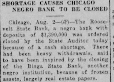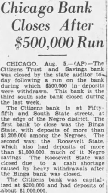 Third Chicago Bank Closed Out by Run Associated Press) CHICAGO, citizens Trust and Savings bank closed the state auditor today following on the bank during which $500,000 deposits were withdrawn. This bank the third South bank closed during the last week. The Citizens bank located and South State, the edge the negro district. The first bank was the Binga State, with posits more than among The second the Roosevelt State, which also more than much negro savings.