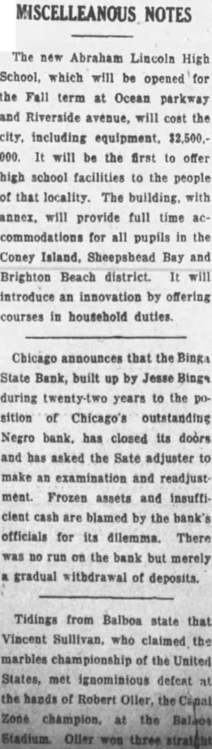 MISCELLEANOUS The Abraham Lincoln High School, which will be the Fall term at Ocean parkway Riverside avenue, will cost the city, including equipment, $2,500.000. will be the first to offer high school facilities to the people of that locality. The building, with annex, will provide full time commodations for all pupils in the Coney Island, Sheepshead Bay and Brighton Beach district. introduce an innovation by offering courses in household duties. Chicago announces that the Binga State Bank, built by Jesse Bings during twenty-two years to the sition of Chicago's outstanding Negro has closed its and has asked the Sate adjuster make an examination and readjustment. Frozen assets and insufficient cash are blamed by the bank's officials for its dilemma. There run on the bank but merely gradual withdrawal of deposits. Tidings from Balboa state that Vincent Sullivan, who claimed the marbles championship of the United States, ignominious defeat hands of Robert Oller, Zone the