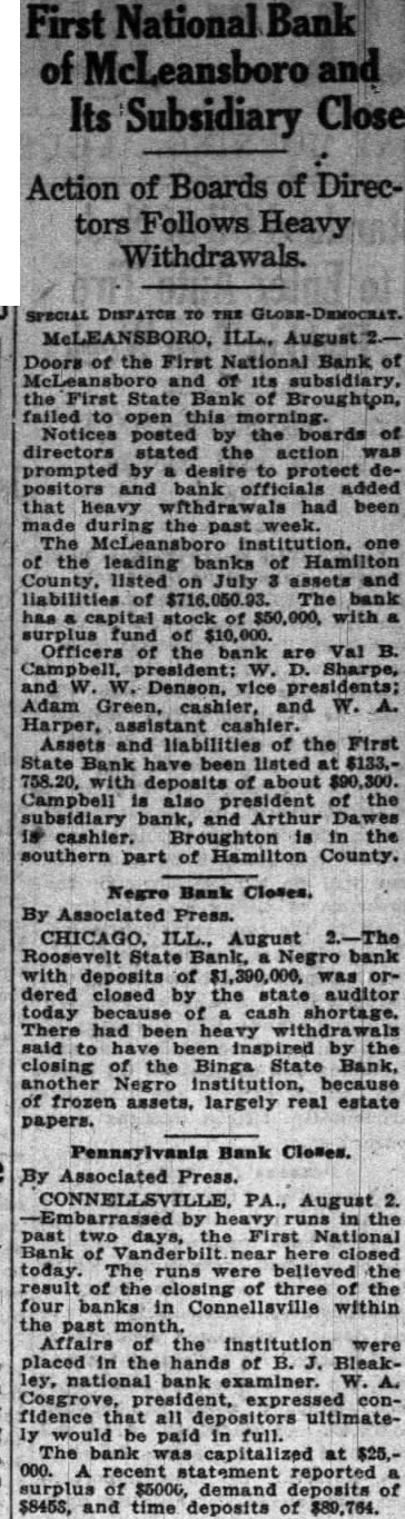 First National Bank of McLeansboro and Its Subsidiary Close Action of Boards of Directors Follows Heavy Withdrawals. DISPATCH TO THE ILL. August Doors of the First Bank of the First State Bank Broughton, failed open this Notices the boards directors stated action prompted desire protect that been during The the leading banks Hamilton County, listed assets liabilities of $716,050.93. The has Officers bank Val president: Sharpe, Denson, vice Adam and Assets and liabilities of the First with deposits Campbell president the subsidiary bank, and Arthur Dawes cashier. Broughton is the southern part of Hamilton County. Negro Bank Closes. By Associated CHICAGO. August Roosevelt with deposits of $1,390,000, closed the state auditor today because shortage. There had been heavy the closing the Binga State Bank, another Negro because of frozen assets, largely real estate papers. Bank Closes. By Associated Press. PA., August by past two days, Bank closed today. The runs believed the result of the closing three four banks in Connellaville within the past Affairs institution were placed in the hands of Bleakbank examiner. W. Cosgrove, fidence all ultimatebe paid in full. The bank at 000. statement reported demand deposits $8458, and time deposits of $89,764.