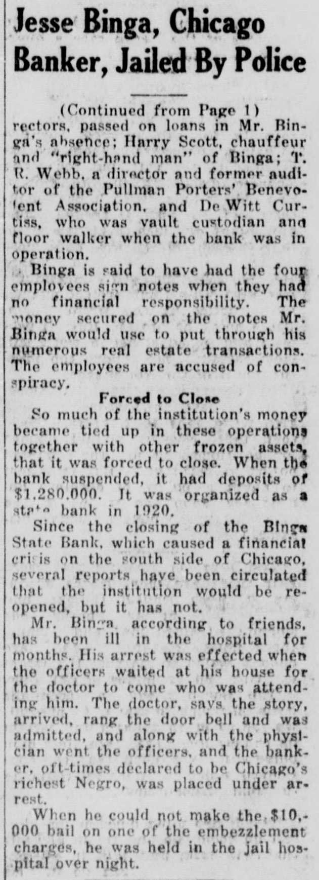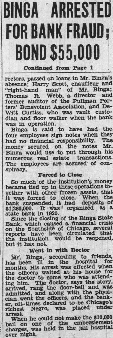 BINGA ARRESTED FOR BANK FRAUD; BOND $55,000 Continued from Page rectors, passed on loans Mr. Binga's absence; Harry Scott, chauffeur and "right-hand man" of Mr. Binga; Thomas Webb, director former auditor of the Pullman Porters' Benevolent Association, and DeWitt Curtiss, was vault custodian floor walker when the bank was in operation. Binga said to have had the four notes when they had financial responsibility. The secured on the notes Mr. money Binga would use to put through estate transactions. The employees are accused of conspiracy. Forced Close So much of the institution's money became tied up these operations other frozen assets, that gether forced When the bank had deposits of organized as state bank in Since the closing of the Binga State Bank, financial crisis the Southside of Chicago, several reports have that the institution would be reopened, it has Went in with Doctor Binga, to friends, been in the for has His arrest was effected waited at his for the the doctor come attenddoctor, the story, him. the arrived, admitted, rang along with the physiwent the officers, the bankdeclared richest Negro, was placed under arrest. When he could not make the $10,000 bail on one held in the jail hospital charges, over night.