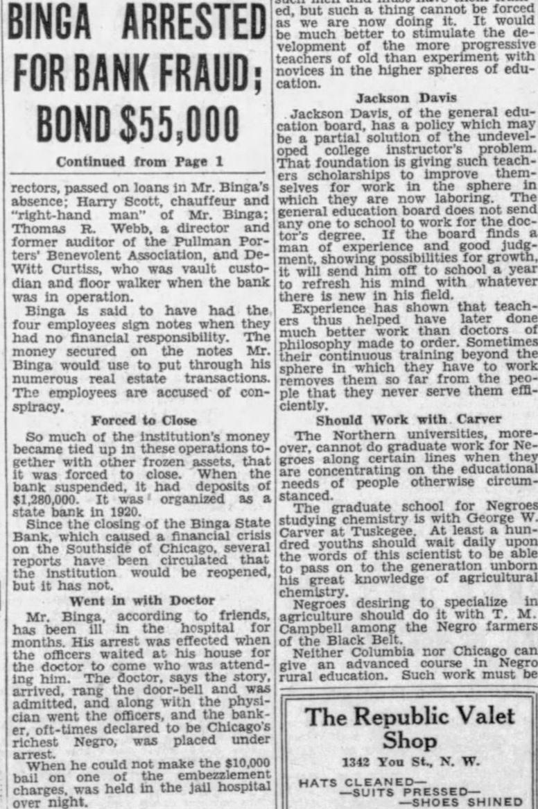 BINGA ARRESTED FOR BANK FRAUD; BOND $55,000 Continued from Page rectors, passed on loans in Mr. Binga's for in the sphere absence; Scott, and which they are now The Harry general does not man" of Mr. Binga; to school work for the docone Thomas director and degree. the finds former auditor of the Pullman Porof and judgman ters' Benevolent and Defor Witt Curtiss, who was vault custo- will send off to school year dian and floor when the bank to his in his field. in operation. new has shown that teachBinga said to have had the thus helped have later ers sign notes much than doctors no financial made order money secured on the notes Mr. their training beyond the Binga would use to put through his which they have work sphere in estate far from the removes ple that they never serve them effiThe employees are accused of conspiracy. ciently. Forced to Close Should Work with Carver So much of the institution's money The Northern universities, became tied up in these operations to- over, do work for Negroes certain when gether other frozen along forced close. When the are of otherwise circumneeds people deposits stanced. It organized as The graduate school for Negroes state bank in 1920. studying chemistry with George Since the closing of the Binga State At hunBank, which caused financial crisis should wait daily upon on the Southside of Chicago, the words of this scientist to able reports have that on to the generation unborn be pass would reopened, knowledge of agricultural great but it has Went in with Doctor chemistry. Negroes desiring to specialize in Mr. Binga, to friends, should do with in the for Campbell the Negro farmers His arrest was effected when of the Belt. the officers waited at his house for Neither Columbia nor Chicago can doctor come who was attend- an advanced course ing him. The doctor, says the story, rural education. Such work must be arrived, rang the admitted, and along the physician went the officers, and the bank- The Republic Valet declared to be Chicago's richest Negro, placed under Shop arrest. When he could not make the $10,000 1342 You St., N. W. bail on one HATS held in the jail hospital -SUITS PRESSEDover night. -SHOES SHINED