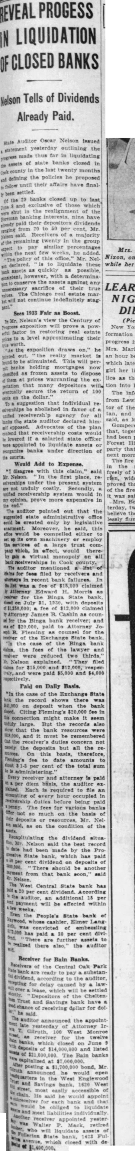REVEAL PROGESS LIQUIDATION CLOSED BANKS Nelson Tells of Dividends Already Paid. Nelson issued the far in progress of closed assets in months the he defining proposed and their have banks up to last of which June in the of the were nine have Foreman their already 20 to per cent, Mr. of in the group similar percentages the next few he added. within of Mr. liquidate these assets as quickly as possible, with a the assets against any sacrifice of their true unnecessary The Chicago real estate marwill not continue indefinitely stag. Sees Fair as Boost. Nelson's view the Century of will prove Progress in restoring real estate level approximating their prices true the exposition draws he pointed out, realty market is be stimulated. This will pernit banks holding now classified as frozen assets to dispose at prices warranting the ex. pectation that depositors secure the return of 100 cents on the suggestion that individual deiverships be abolished in favor of receivership agency for all the state auditor declared himself opposed. Advocates of the plan entend that receivership costs would be if salaried state officer were appointed to liquidate assets or reorganize banks under direction of courts. Would Add to Expense. "I disagree with this claim," said Mr. In the first place, under the present system are unduly costly. Secondly, unified receivership system would in opinion, prove more expensive in the The auditor pointed out that the suggested state office could be created only by Moreover, he said, this office would be compelled to set its own or employ the of large trust pany in effect, would thereby gain virtual monopoly on all in county. The auditor mentioned time for fees filed by receivers and alterneys in recent bank failures. In was fee of $15,000 claimed If Attorney Edward H. Morris as for the Binga State on July 31, with deposits Attorney James B. Cashin as counfee the Binga bank receiver; and of paid to Attorney B. Fleming RS counsel for the receiver of the Exchange State bank. "In the case of the Binga bank claims, the fees of the lawyer and receiver were reduced two thirds,' Mr. Nelson explained. They filed claims for and respec. were paid $5,000 and $4,000 Paid on Dally Basis. "In the case of the Exchange State lank the record shows there was 441,000 on deposit when the bank tissed. Citing Fleming's $20,000 fee in this connection might make it seem large. But the records also show that the bank resources were 1118,000, and it must be remembered that the receiver's duties concern not merely the deposits but all the resources. On this basis, therefore, Fleming's fee to date amounts to about per cent of the total sum administering. Every receiver and attorney is paid per diem basis. the auditor exEach is required to file an of hour occupied receivership duties before being paid *penny. The fees for various banks not so much on the basis of their deposits or resources, Mr. Nel. NA as on the condition of the payment Even the was has realized After the dividend Nelson said the best record date had been made by the tressive State bank, which has paid cent dividend on deposits of There should be another from that bank said Central bank has 20 per cent According auditor, additional per People's State bank of convicted of paid 20 per cent There are further assets to there the auditor of the Central Oak are to according to the auditor, delay caused by which be settled Depositors of and bank have of receiving dollar for dol- auditor announced late of yesterday 100 as receiver for which deposits of $14,000,000 of The at announced and Savings most easily He said he each be meet liabilities was who Fullerton State appoint Attorney West Monroe on June and Bain banks bond, would open 1620 West accessible of appoint retired assets of 1423 Ful closed with
