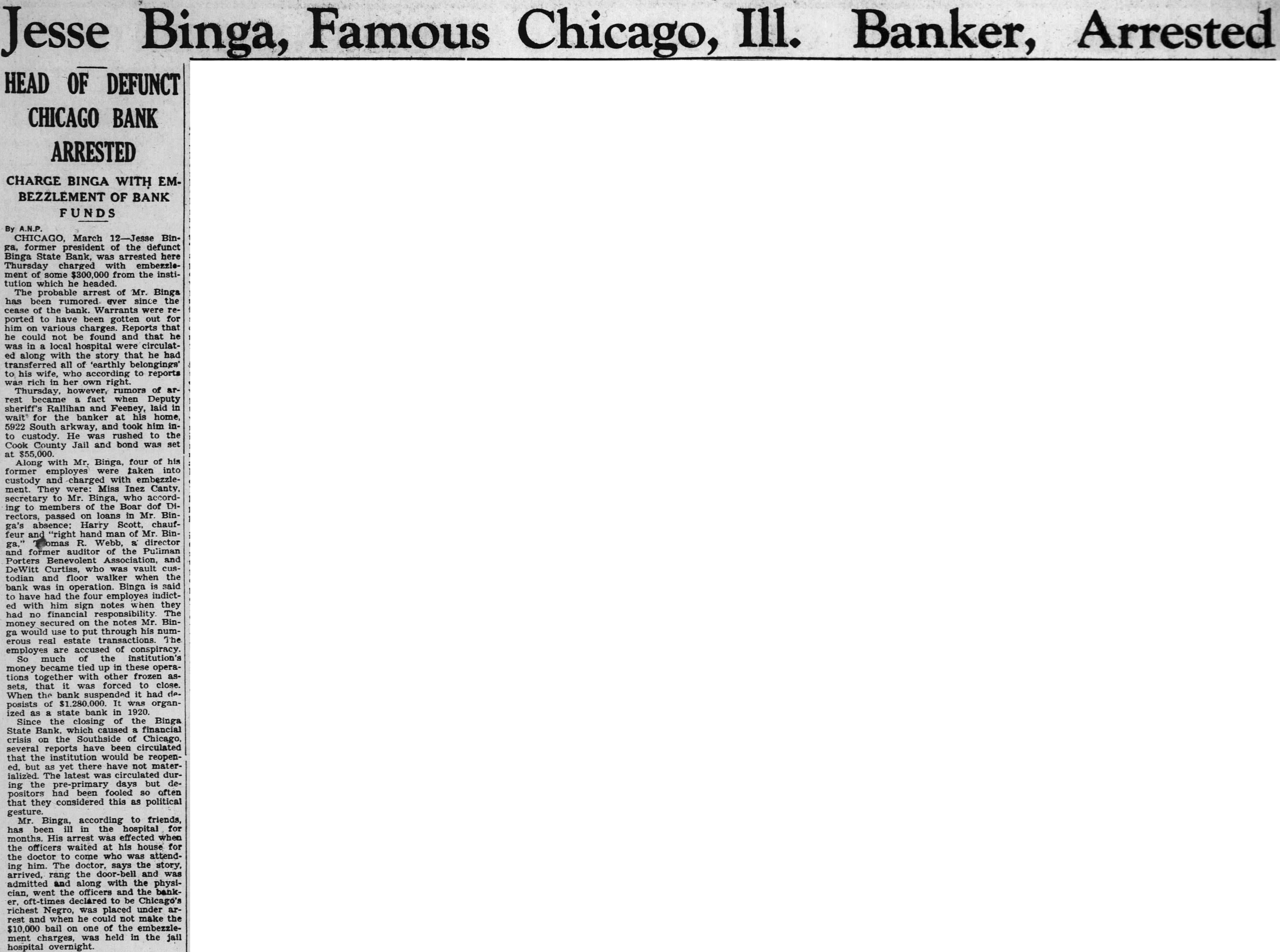 Arrested Jesse Binga, Famous Chicago, Banker, HEAD OF DEFUNCT CHICAGO BANK ARRESTED CHARGE BINGA WITH EMBEZZLEMENT OF BANK FUNDS By A.N.P. CHICAGO, March 12-Jesse Binga, former president of the defunct Binga State Bank, was arrested here Thursday charged with embezzlement of some $300,000 from the institution which he headed. The probable arrest of Mr. Binga has been rumored ever since the cease of the bank. Warrants were reported to have been gotten out for him on various charges. Reports that he could not be found and that he was in a local hospital were circulated along with the story that he had transferred all of 'earthly belongings' to his wife, who according to reports was rich in her own right. Thursday, however, rumors of arrest became a fact when Deputy sheriff's Rallihan and Feeney, laid in wait for the banker at his home, 5922 South arkway, and took him into custody. He was rushed to the Cook County Jail and bond was set at $55,000. Along with Mr. Binga, four of his former employes were taken into custody and charged with embezzlement. They were: Miss Inez Canty. secretary to Mr. Binga, who according to members of the Boar dof DIrectors, passed on loans in Mr. Binga's absence; Harry Scott, chauffeur and "right hand man of Mr. Binga," Tomas R. Webb, a director and former auditor of the Puliman Porters Benevolent Association, and DeWitt Curtiss, who was vault custodian and floor walker when the bank was in operation. Binga is said to have had the four employes indicted with him sign notes when they had no financial responsibility The money secured on the notes Mr. Binga would use to put through his numerous real estate transactions. The employes are accused of conspiracy. So much of the institution's money became tied up in these operations together with other frozen assets, that it was forced to close. When the bank suspended it had deposists of $1,280,000. It was organized as a state bank in 1920. Since the closing of the Binga State Bank. which caused a financial crisis on the Southside of Chicago, several reports have been circulated that the institution would be reopened. but as yet there have not materialized. The latest was circulated during the pre-primary days but depositors had been fooled so often that they considered this as political gesture. Mr. Binga, according to friends, has been ill in the hospital for months. His arrest was effected when the officers waited at his house for the doctor to come who was attending him. The doctor, says the story, arrived, rang the door-bell and was admitted and along with the physician, went the officers and the banker, oft-times declared to be Chicago's richest Negro, was placed under arrest and when he could not make the $10,000 bail on one of the embezzlement charges, was held in the jail hospital overnight.