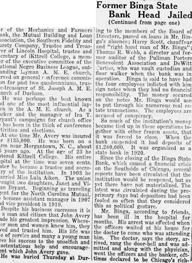 Former Binga State Bank Head Jailed (Continued from page one) ing to the members of the Board of loans Mr. Binga's absence; Harry Scott, "right hand man of Mr. Binga"; Thomas Webb, director former auditor of the Pullman Porters Benevolent Association and DeWitt Curtiss, who was vault custodian and floor walker when the bank in Binga said have had the four indicted sign when they had no financial secured on the Mr. Binga would use put through his real esThe employees are So much of the institution's money became tied these operations together with other frozen assets, that it forced to close. When the bank it had deposits $1,280,000. was organized as a state bank in 1920. Since the closing of the Binga State Bank, which caused financial the of Chicago, several reports have circulated that the be yet there materialized. The latest was during the preprimary days but had this fooled often that they considered as political gesture. Mr. Binga, according to friends, has the for arrest was effected when the officers waited at his house for the doctor who was attending him. The doctor, the story, arrived, rang the and mitted and along with the physician, went the officers and the ofttimes declared to be Chicago's rich-