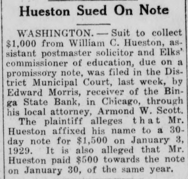# Hueston Sued On Note WASHINGTON. — Suit to collect $1,000 from William C. Hueston, assistant postmaster solicitor and Elks' commissioner of education, due on a promissory note, was filed in the District Municipal Court, last week, by Edward Morris, receiver of the Binga State Bank, in Chicago, through his local attorney, Armond W. Scott. The plaintiff alleges that Mr. Hueston affixed his name to a 30-day note for $1,500 on January 3, 1929. It is also alleged that Mr. Hueston paid $500 towards the note on January 30, of the same year.