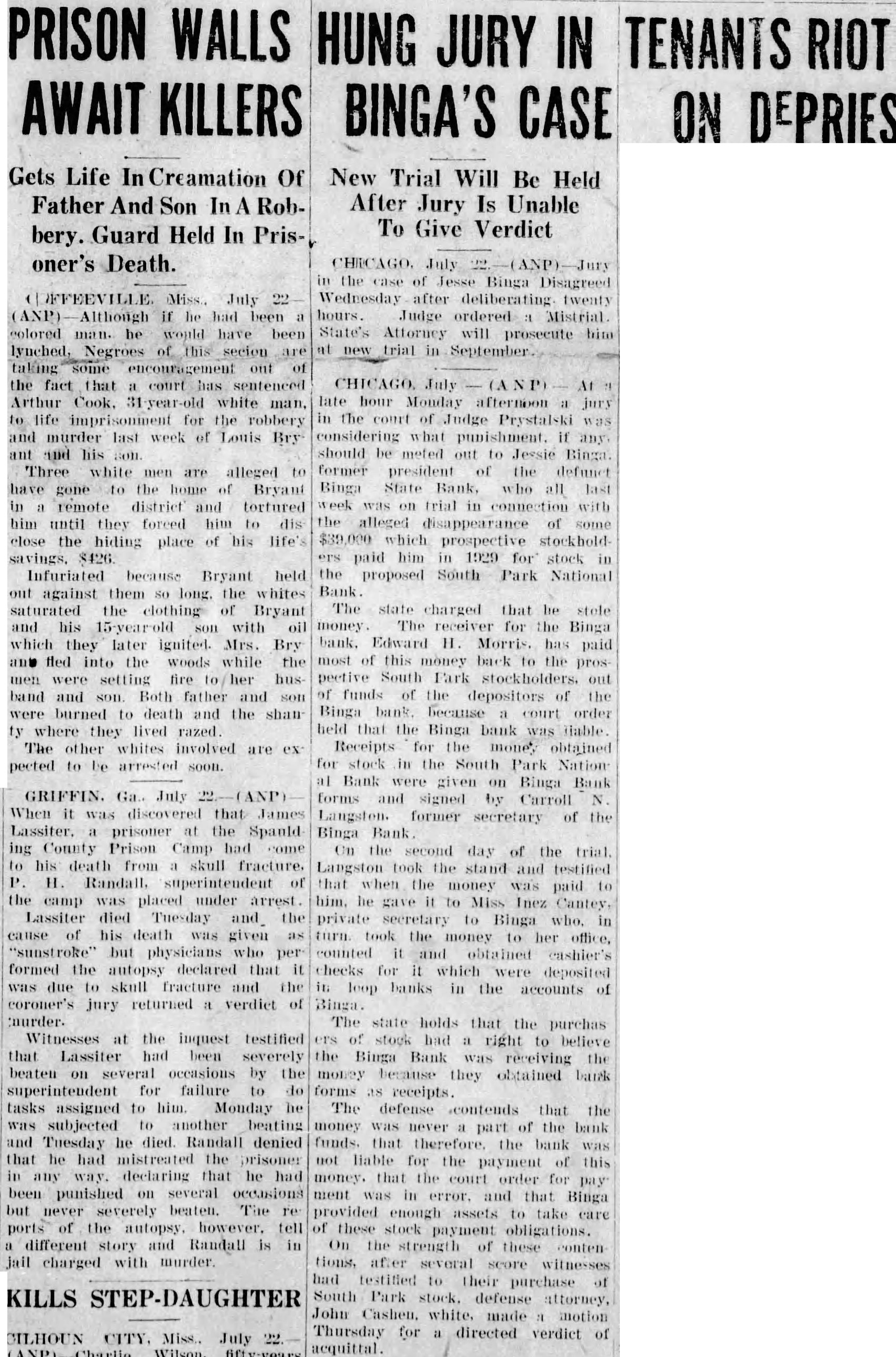 PRISON WALLS HUNG JURY IN TENANTS RIOT AWAIT KILLERS BINGA'S CASE ON DEPRIEST Gets Life Creamation Of Father And Son Robbery. Guard Held In Prisoner's Death. July had been colored man. would have been Negroes secion taking some out the fact that sentenced Arthur Cook. white man. life imprisonment for robbery and murder last week of Louis Bry ant and his Three white men are alleged have gone the home Bryant in remote district and tortured him until they forced him dis close the hiding place of his $426. Infuriated because Bryant held against them long. the whites saturated the clothing of Bryant and his with oil which they later ignited. Mrs. Bry fled into the woods while the men were setting fire hus band and son. Both father and son were burned death and the shan where they lived The other whites involved are pected to arrested soon. GRIFFIN. Ga. July When was that prisoner at the County Prison Camp had his death from skull fracture. Randall. superintendent the camp was placed under arrest Lassiter died Tuesday and the cause his death was given "sunstroke" but physicians who per formed the autopsy declared that was due skull fracture and the coroner's jury returned verdiet of Witnesses at the inquest testified that Lassiter had been severely beaten several occasions by the superintendent for failure to tasks assigned to him. Monday subjected to another beating and Tuesday he Randall denied that he had mistreated the prisoner any declaring that he had been punished on several occasions never severely beaten. The ports of the autopsy. however, tell different and Randall in jail charged with murder. New Trial Will Be Held After Jury Is Unable To Give Verdict the of Jesse Binga Disagreed Wednesday after deliberating twenty hours. Judge ordered Mistrial State's Attorney will prosecute him late hour Monday afternoon jury in the court Judge Prystalski considering what punishment. if any should meted out to Jessie Binga former president of the defunct Binga State Bank, who all last week trial in connection the alleged disappearance of $39,000 which prospective stockhold paid him 1929 for stock the proposed South Park National Bank The state charged that he stole money The receiver for the Binga bank. Edward Morris. has paid most of this money back to the prospective South Park stockholders. out funds of depositors of the Binga bank. because court order held that the Binga bank was liable Receipts for money obtained for stock in the South Park Nation Bank were given on Binga Bank forms and signed by Carroll Langston. former secretary of Binga Bank On second day of the trial. Langston took stand and testified that when the money paid to him. he gave to Miss Inez private secretary to who, turn. took the money her office, counted cashier's checks for which deposited loop banks in the accounts The holds that the purchas stock right to believe the Binga Bank receiving the money they obtained batek forms receipts The defense contends that the money was never part of the bank funds. that therefore, the bank not liable for the payment money. that the court order for pay ment in error. and that Binga provided enough assets to take care these stock payment obligations. On the strength of these conten tions, several score witnesses had their purchase South Park stock. defense attorney, John made motion Thursday for directed verdict of acquittal.